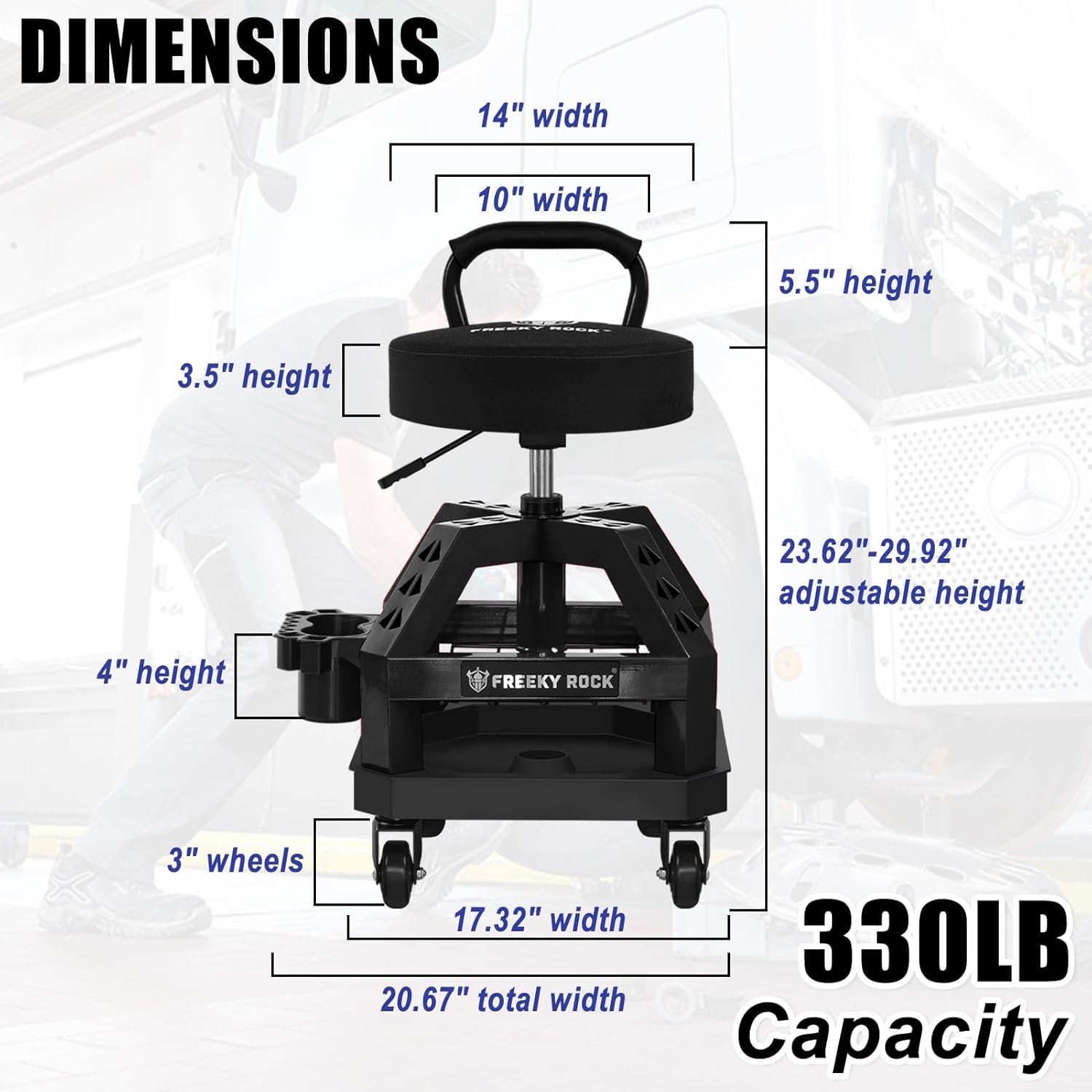 - Heavy Duty Garage Mechanic Stool -The Rolling Mechanic Stool is constructed with a robust angle steel frame, ensuring durability and reliability. Ideal for use in garages, workshops, and other demanding work environments. Its sturdy build can support up to 330 pounds.