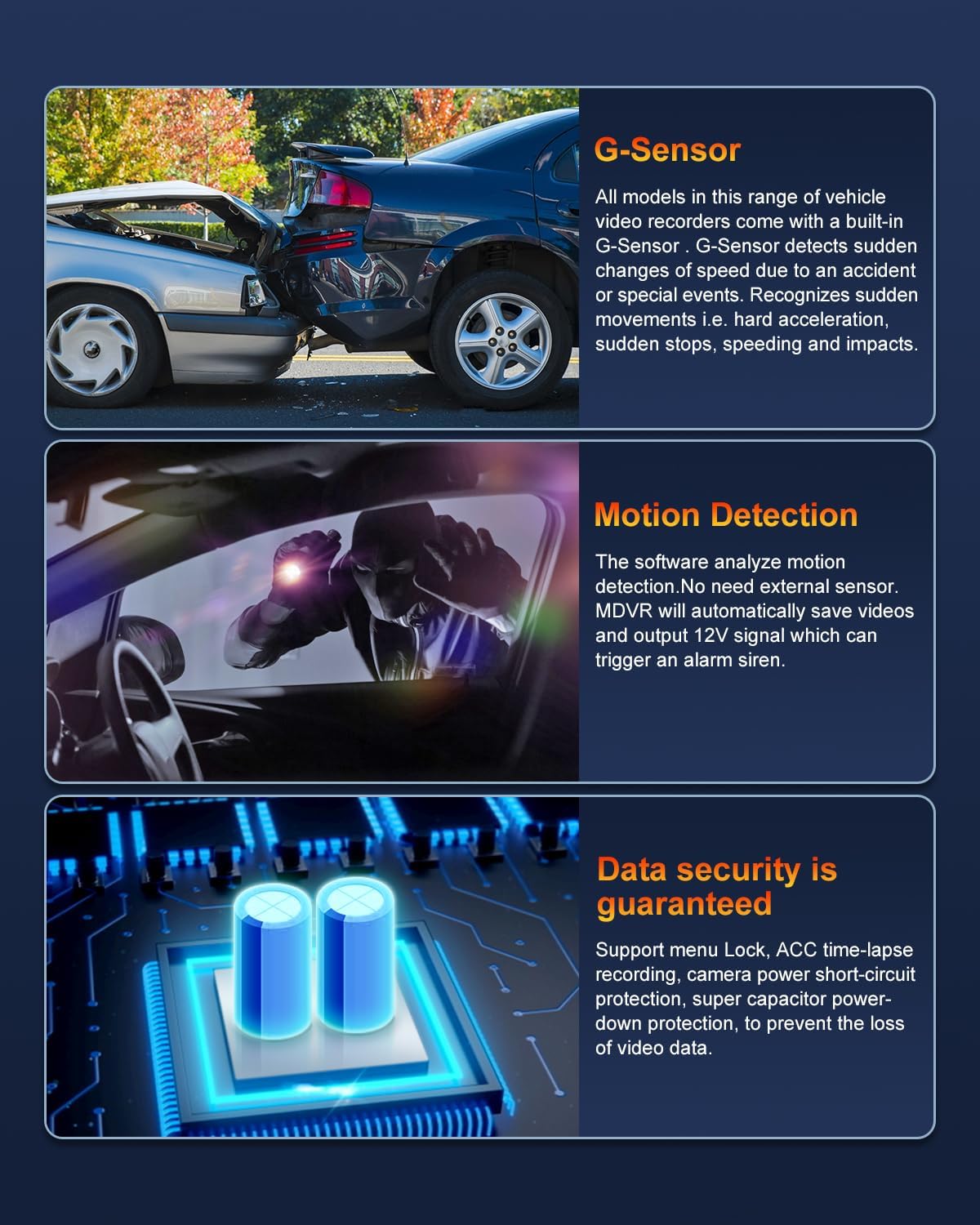 - Protection Features: Includes camera power short-circuit protection and super capacitor power-down protection to prevent video data loss, ensuring your footage remains intact.