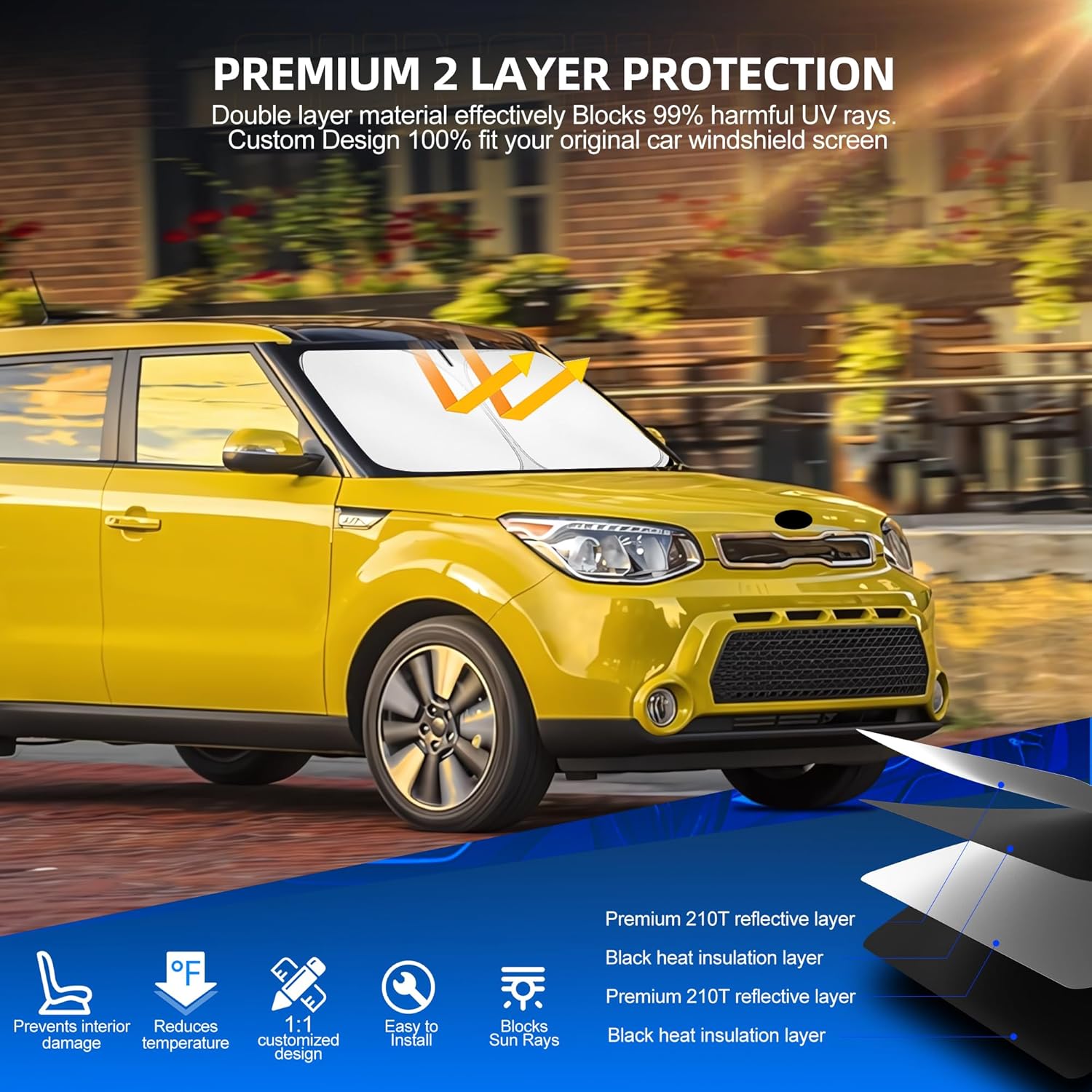 - 𝐃𝐨𝐮𝐛𝐥𝐞 𝐋𝐚𝐲𝐞𝐫𝐬 𝐏𝐫𝐨𝐭𝐞𝐜𝐭𝐢𝐨𝐧: Our sunshade features a double-layer design with black heat-insulating layers on the inside and a silver reflective surface on the outside. Double insulation, and double protection, this custom-fit windshield shade blocks up to 131% of sunlight and UV rays,protect well your car interior accessories