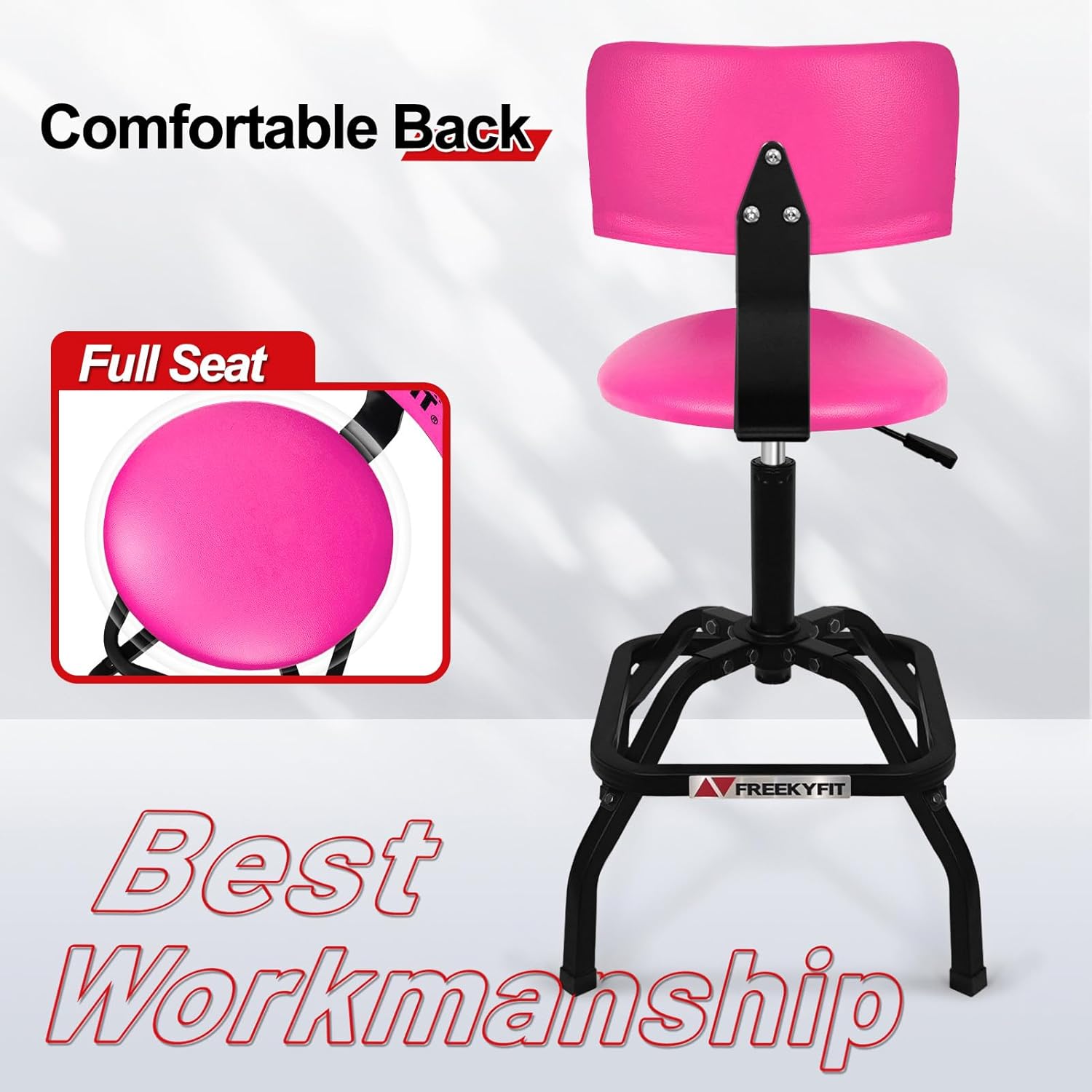 Shop Stool with Backrest, Mechanic Garage Stool for Workshop, Adjustable Shop Stools Chair, Padded Workbench Stools for Men Women, 300 LBS Capacity, 360° Swivel PVC Seat, Heavy Duty, Pink