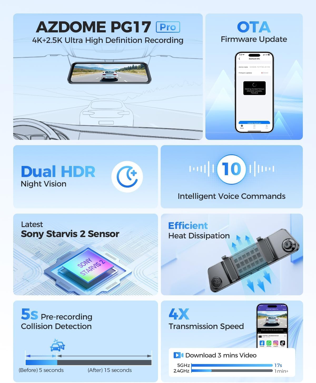 - [5G WiFi @10MB/s Transfer] Download accident footage 4X faster than standard dashcams via 5GHz WiFi. The AZDOME app lets taxi/rideshare drivers instantly share HD videos with insurance teams or clients without removing the memory card.
