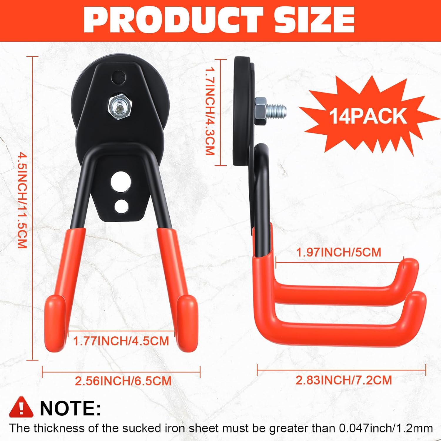 - Easy to Install: no need to use any tools, and the magnetic hooks will not break the surface; The orange magnetic hooks can be placed directly on the metal surface; Please note that the thickness of the sucked iron sheet must be thicker than 0.047 inch/ 1.2 mm; Or else the magnetic hook will slide off