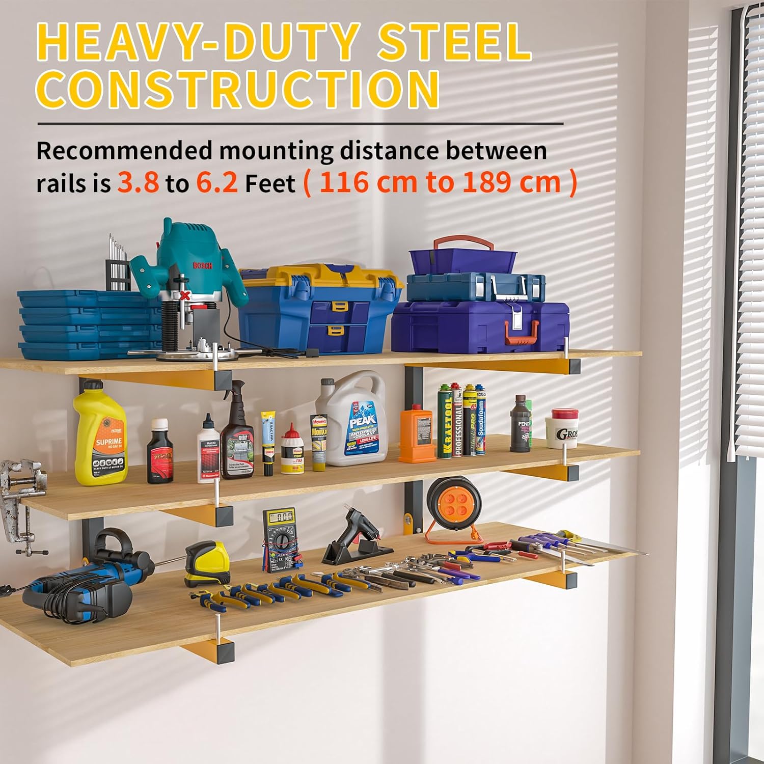 - EFFICIENT USE OF SPACE: Garage Wall Shelving is the perfect wall storage solution to prevent building materials from spilling on the floor and keep the garage organized and easy to clean. Save space in your garage, basement, shed, or outdoor workspace. Storage racks and shelves for storing wood, firewood, tool boxes, metal sheets, PVC pipes, ladders, skis, construction tools, bicycles, tires, wood working tools, etc.