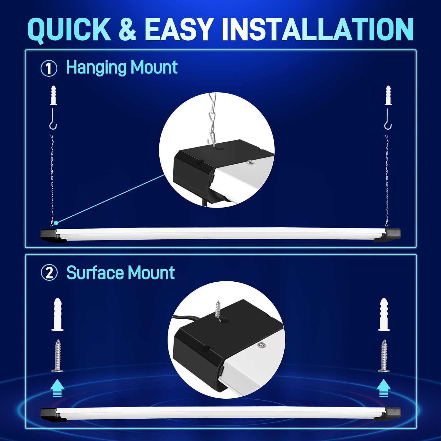 - ✅ Easy Installation - Plug & Play. Come with 59" power cord with on/off switch and other small accessories. You can hanging it with the included hanging chains or directly mounted to the ceiling with the included mounting screws.