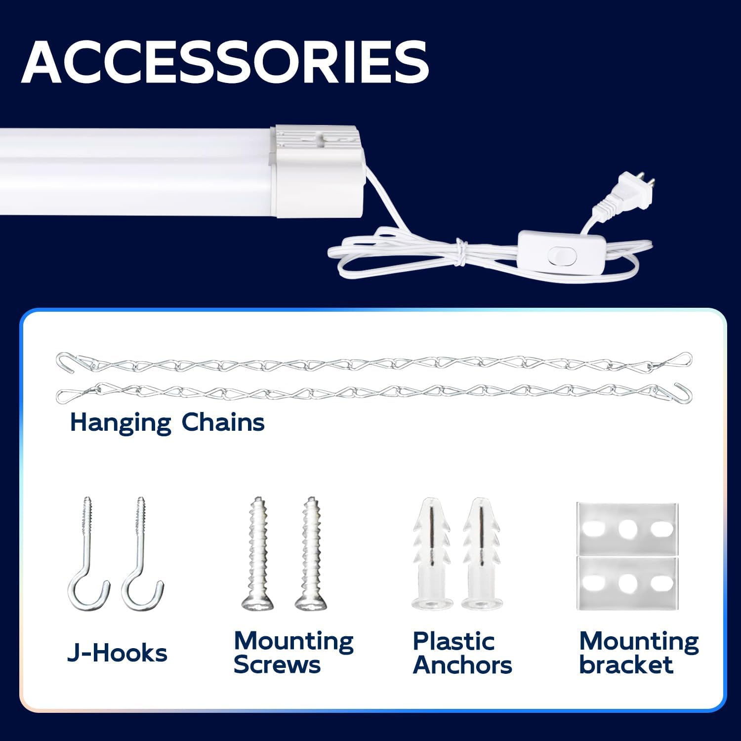 - ✅ Easy Installation - Plug & Play. Come with 59" power cord with on/off switch and other small accessories. You can hanging it with the included hanging chains or directly mounted to the ceiling with the included mounting screws.