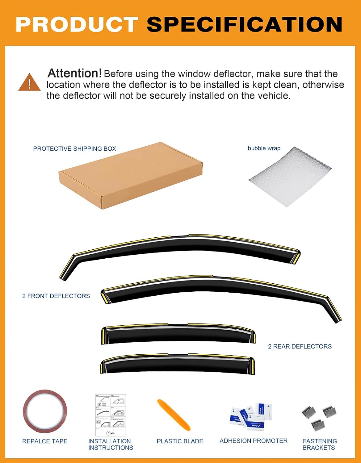 - 【Full-size Side Window Deflectors】This 4-piece set includes passenger, driver side rain guards that create a seamless look that protects you from sun rays, rain drops, and wind while you’re driving with the window down.