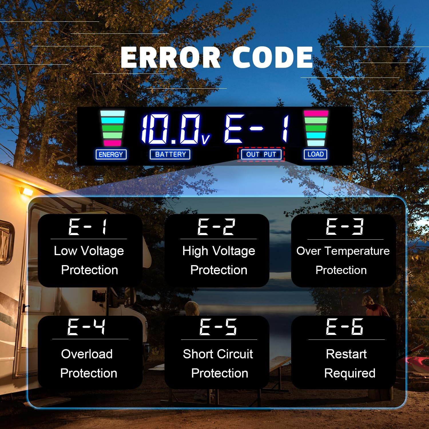 - MULTI-PROTECTION: 6 kinds of protection to against: Overload / Short Circuit / Over heat / Reverse Polarity / Under or Over Voltage protections. Make your batteries and appliances safer. And we have 12-Months Warranty.
