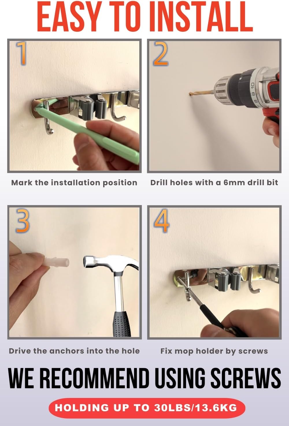 - VERSATILE STORAGE: Each holder features multiple slots and hooks to securely grip handles of different sizes for brooms, mops, rakes, and other tools