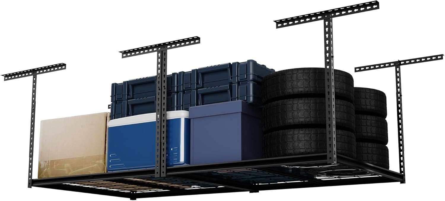- 【Adjustable Height Rack】 Drop range of 26"–48" fits most garage ceilings and offers up to 122 cubic feet of overhead space—ideal for bins, tires, tools, and seasonal gear. Frees up valuable floor area for vehicles and workstations