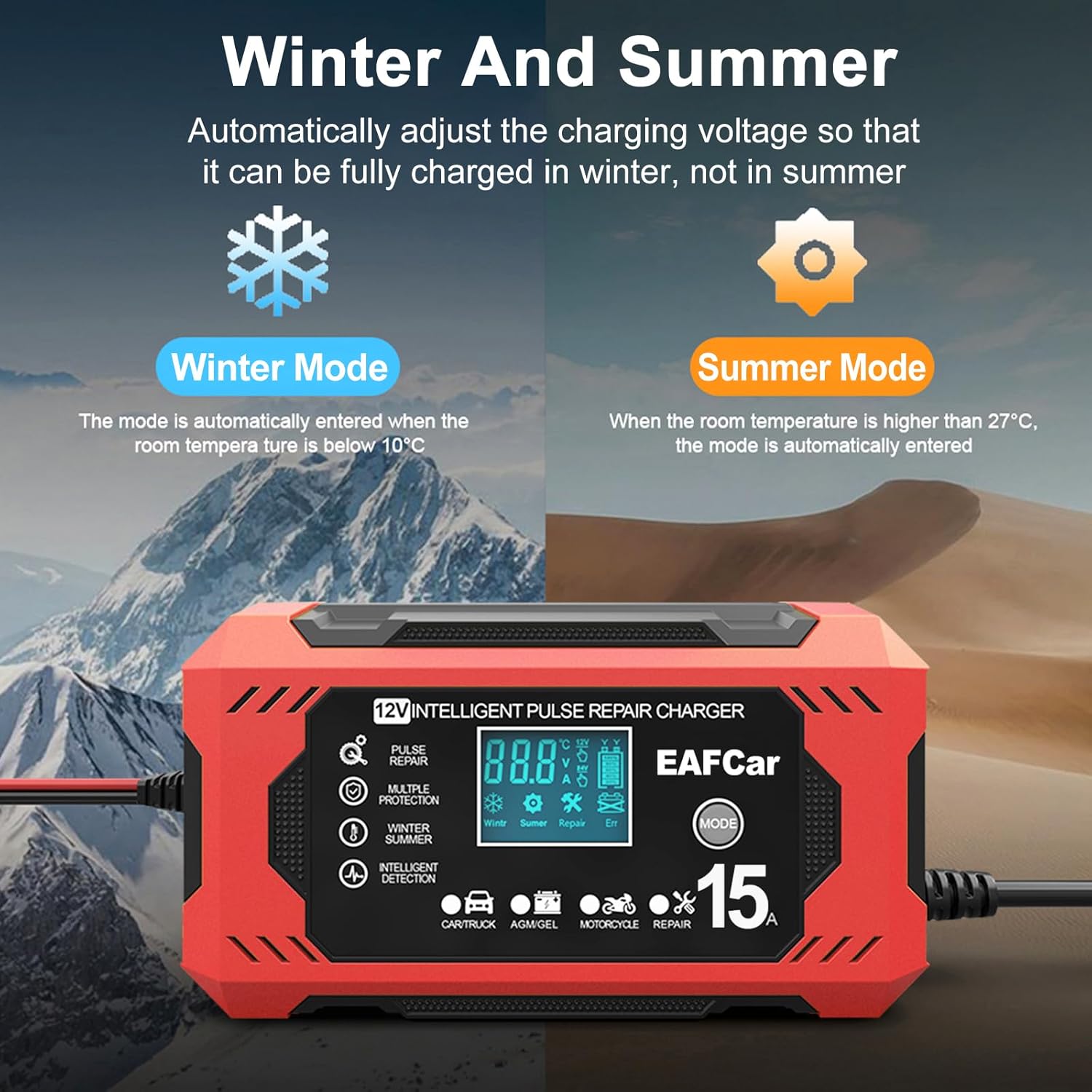 - 🔋【LARGE LCD DISPLAY VISUALIZED CHARGING】Just plug and play, leave the car battery charger booster there for charging and maintaining your batteries, automatically detect battery voltage, battery sulfation and acid stratification.The smart digital LCD screen of the auto battery charger displays the charging status and battery status.