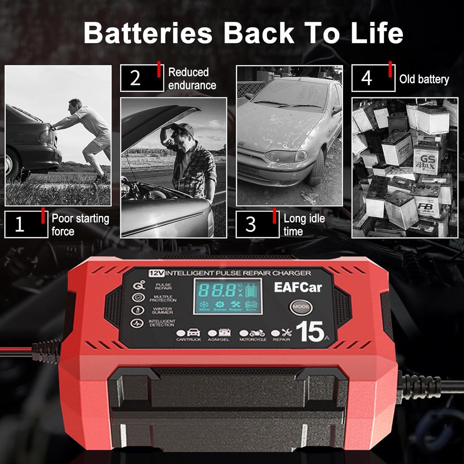 - 🔋【QUICK BATTERY CHARGER】12 volt 15-Amp quick car battery charger, can charge or repair all 12-volt lead-acid automotive, marine and deep-cycle batteries including AGM, GEL, SLA, Flooded in cars, trucks, SUVs, motorcycles, lawn mowers, boats, etc.