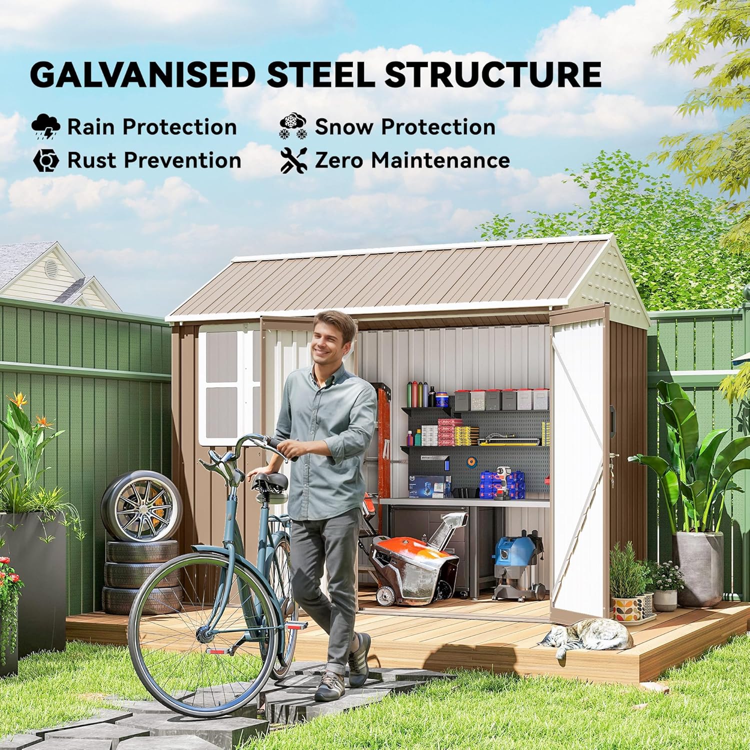 Outsunny 8' x 6' Outdoor Storage Shed, Metal Garden Shed with Window & Double Lockable Door, Outdoor Tool Shed Storage with Sloped Roof for Backyard, Patio, Garage, Lawn, Brown