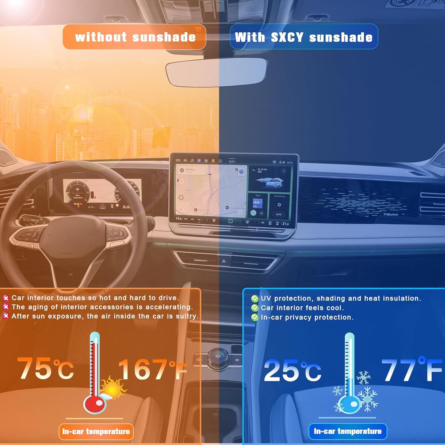 - 1.Custom Fit: this windshield sun shade is custom designed for 2025 VW Tiguan sunshade for 2025 Tiguan accessories front window.You don’t need to worry about oversize or too small,consider it if you need a car protector cover that protects your car interior from sunburn.