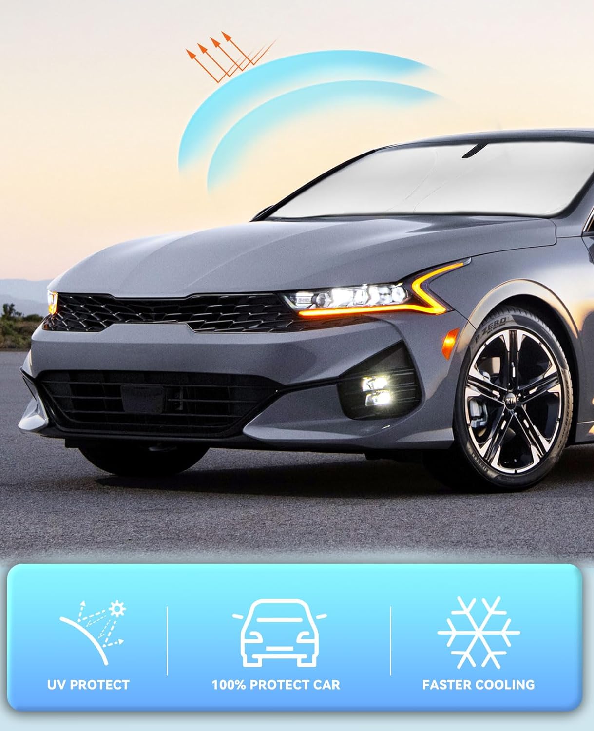 - 【Vehicle Specific】Our Windshield Shade Cover Custom Fit for 2021-2024 2025 2026 Kia K5, GT-Line, GT, Premium Plus, Prestige Crossover SUV, Full covered your windshield,No Gap,100% Perfect fit. The precise fit design and reinforced steel ring are sufficient to allow the sun shade to precisely fit the front window without the need for suction cups to hold it in place, effectively protecting your car from the sun's rays.