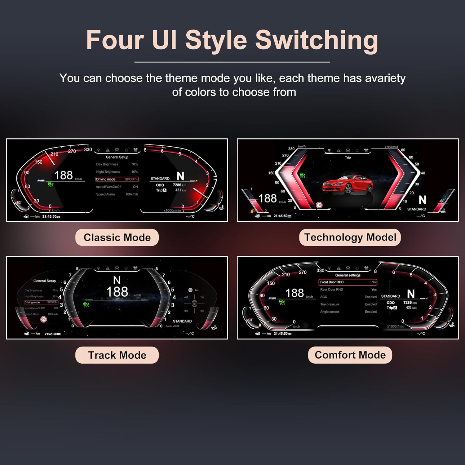 - ✔️[4 sets of UI styles can be freely switched] This digital cluster odometer features 4 customized modes (simple, comfortable, track, and technology) for the LCD. Additionally, it offers 4 color interfaces (red, purple, blue, and orange) that can be freely changed to enhance your driving comfort. The original vehicle data and information are presented more intuitively