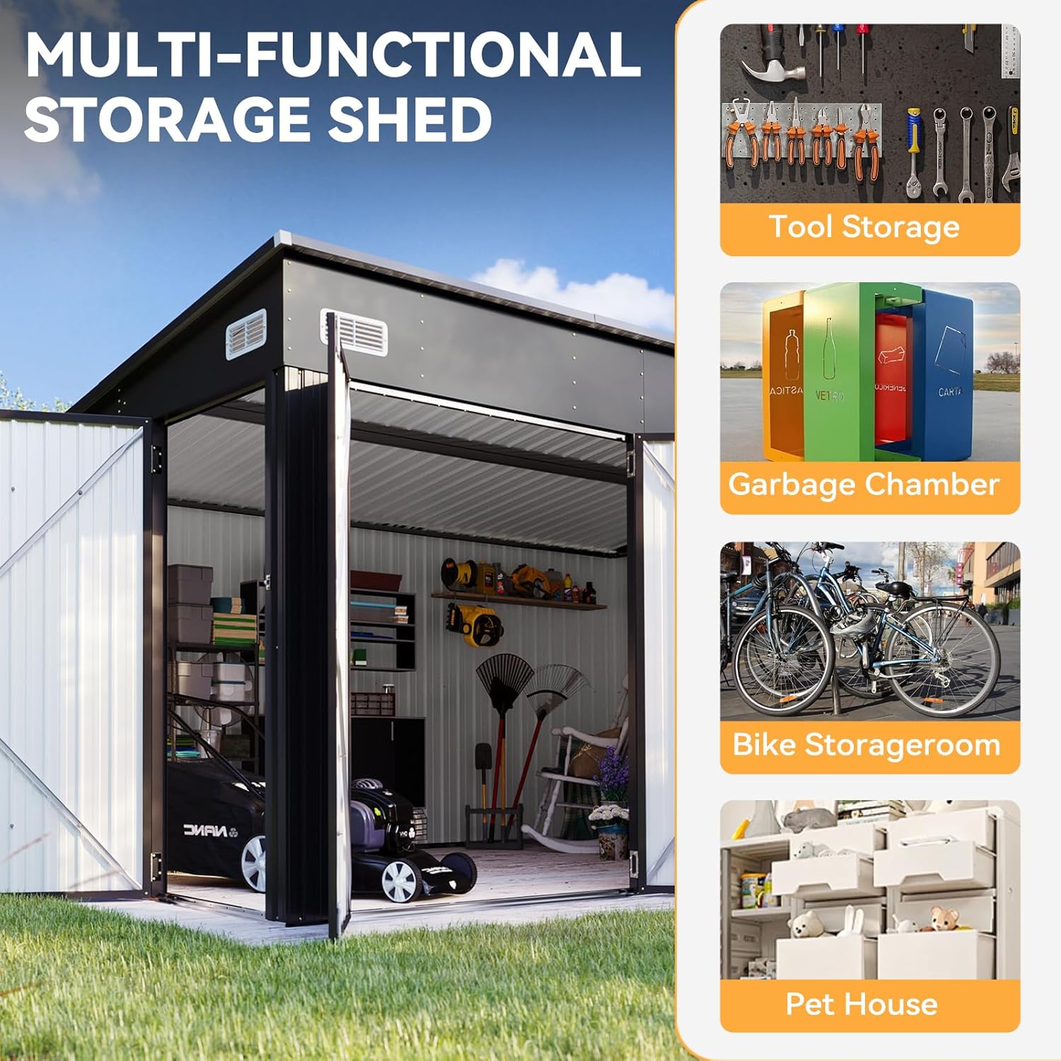- Heightening Design & Multi-purpose Storage: The interior top height has been increased so that there are plenty of room to stand inside and items storage. The storage shed offers ample space to accommodate various outdoor items or tools such as snow blowers, shovels, outdoor chairs, bicycles, and toy cars, thereby promoting a well-organized and tidy yard