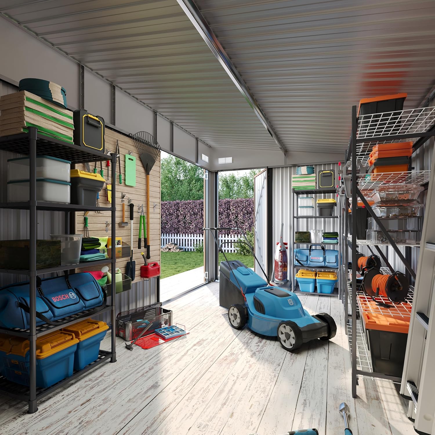 - Stable Construction: The construction of outdoor storage sheds utilizes high-quality materials, such as galvanized steel, to effectively safeguard against rust formation. Moreover, the implementation of color coated panels with powder coating ensures prolonged durability in adverse weather conditions. Furthermore, the incorporation of a stable base and robust structural design enhances stability and safety levels