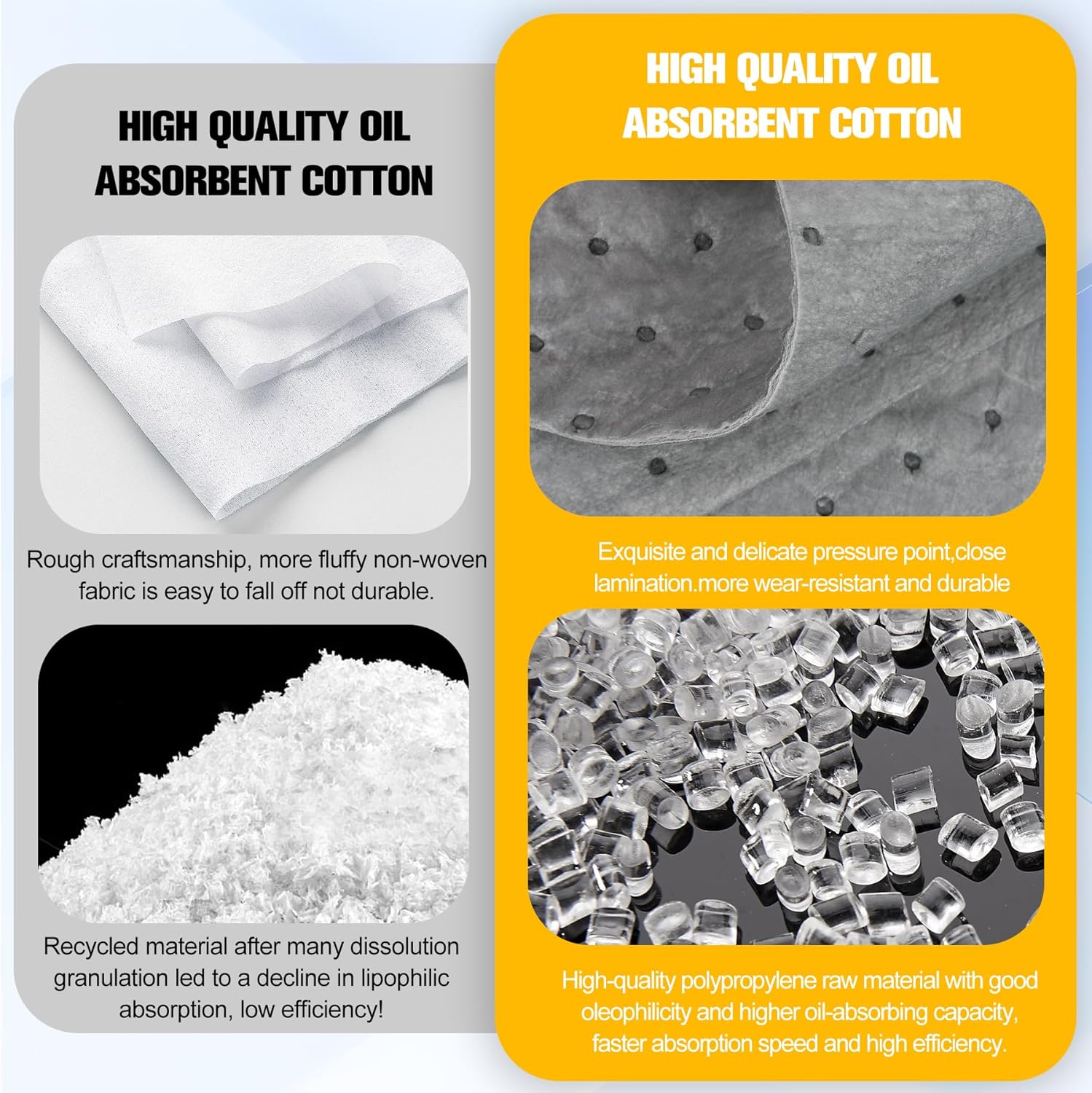 - Meltblown Polypropylene Absorption Core: Multi-layer meltblown construction traps oils, grease, and oil-based liquids 3X faster than standard pads. Precision ultrasonic bonding locks fibers without chemical adhesives – safe for garage floors and workshop tools.