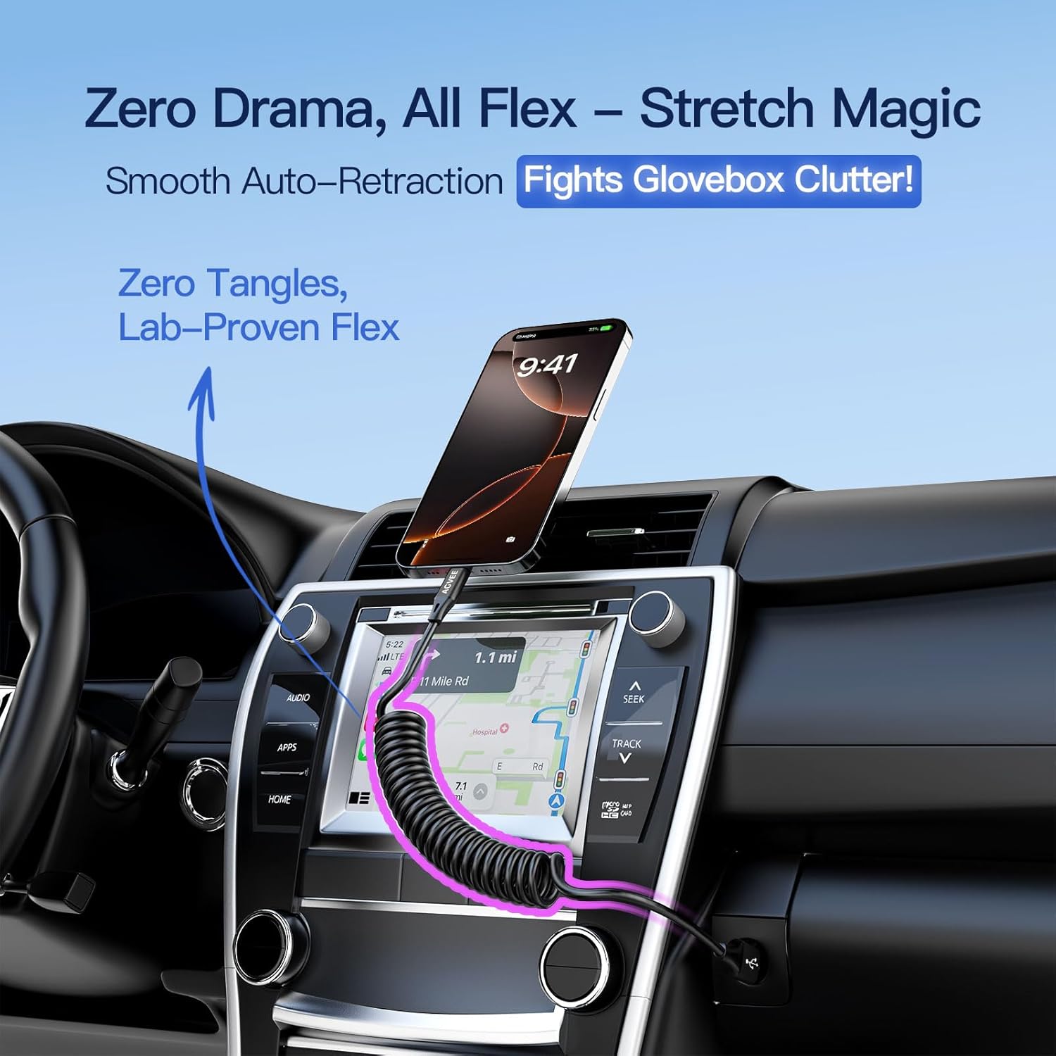 - đźš—[Tame Your Car's Cable Jungle] No more wrestling with spaghetti cords! Our coiled design stretches from short to long, perfect for tight car spaces, then snaps back neatly like a slinky. Keep your cup holders free for coffee, not tangled chaos! Soft and elastic: No more wrestling with stiff, frozen-spaghetti-like cables in winter; Squishy as a pacifier, coils like a zen master.