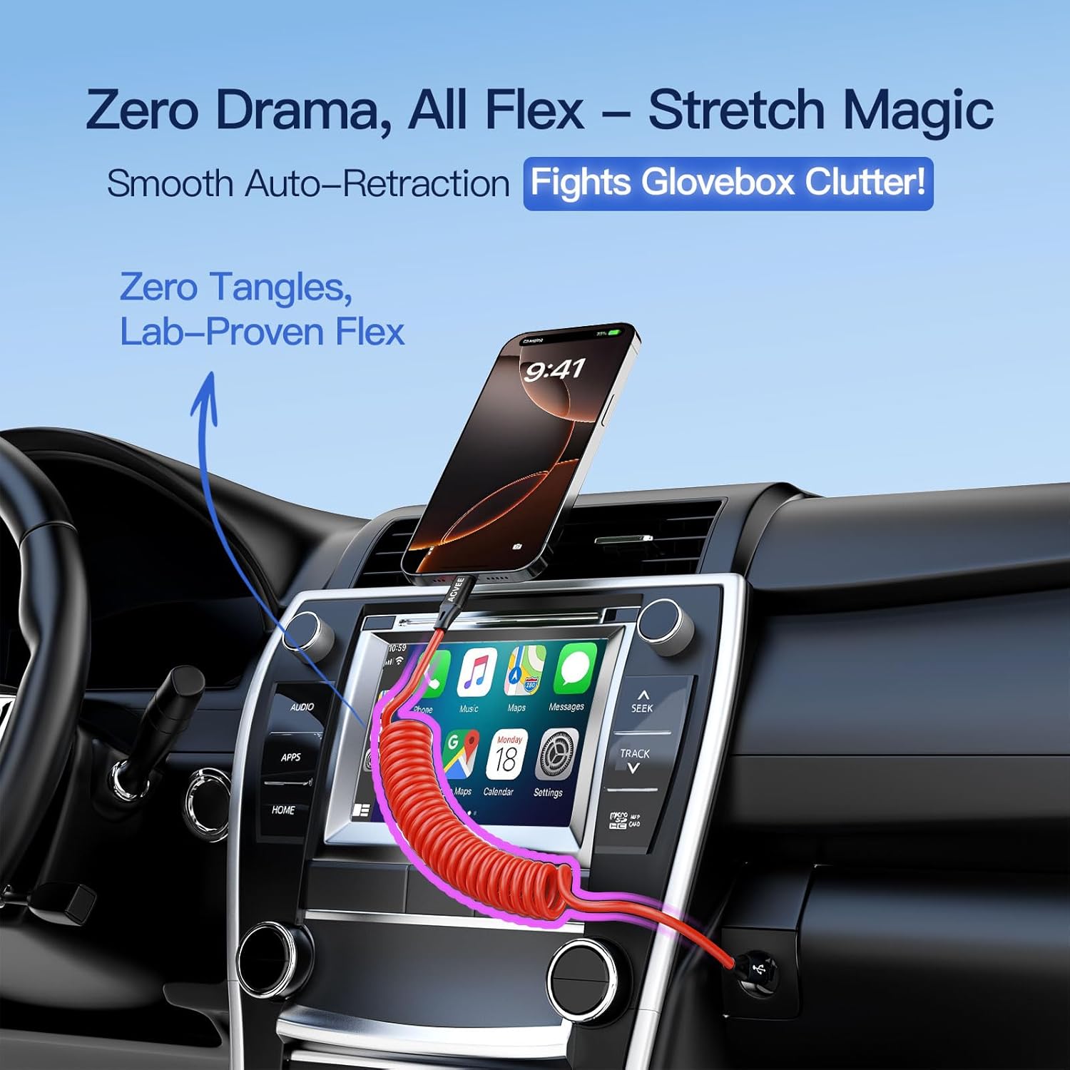 - đźš—[Tame Your Car's Cable Jungle] No more wrestling with spaghetti cords! Our coiled design stretches from short to long, perfect for tight car spaces, then snaps back neatly like a slinky. Keep your cup holders free for coffee, not tangled chaos! Soft and elastic: No more wrestling with stiff, frozen-spaghetti-like cables in winter; Squishy as a pacifier, coils like a zen master.