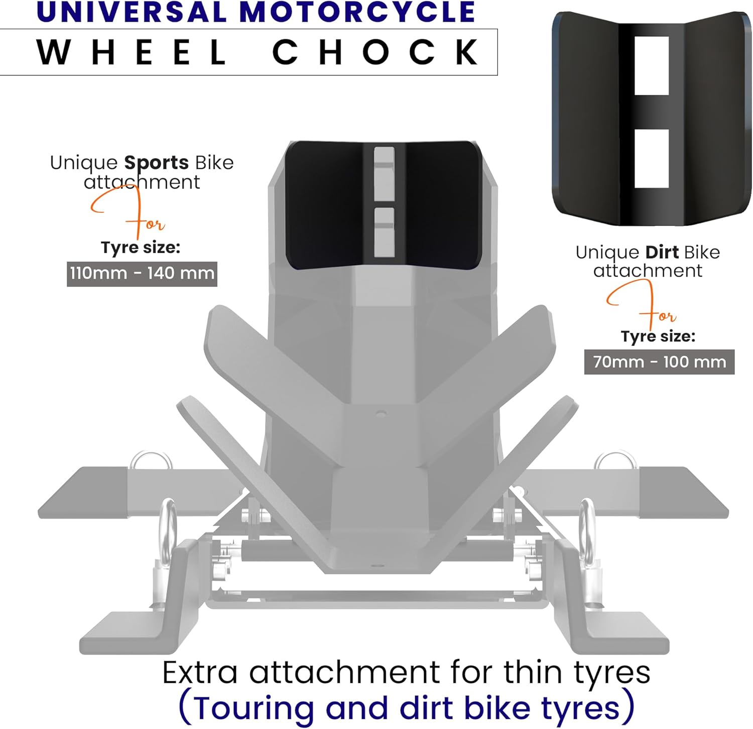 - GRAND PITSTOP Universal Wheel Chock Comes with 3 types of front tire support attachments 1st- Cruiser Bike, 2nd- Sports Bike, 3rd- Dirt Bike. These attachments make it Universal Compatible for all kind of Motorcycles.