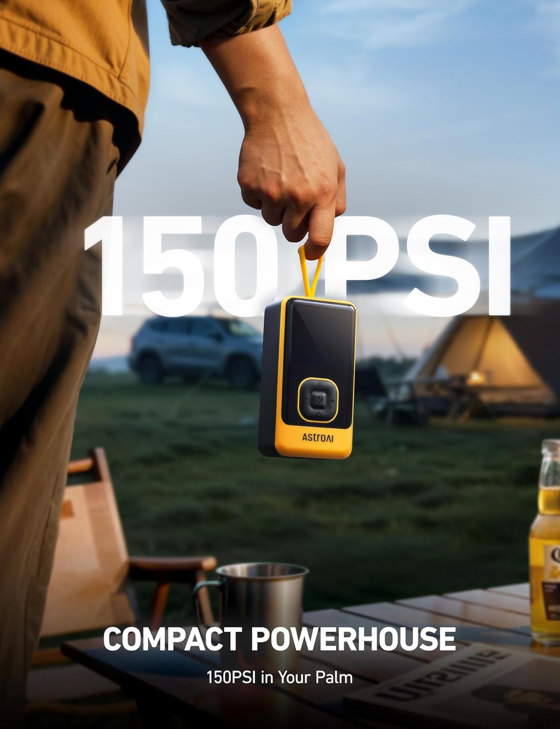 AstroAI L7 Air Tire Inflator Portable Air Compressor, 150PSI Electric Cordless Bike Pump with Fast 1-min Inflation, Auto Shutoff, LED Light – Rechargeable for Car, SUV, Motorcycle, Bike Tires, Yellow