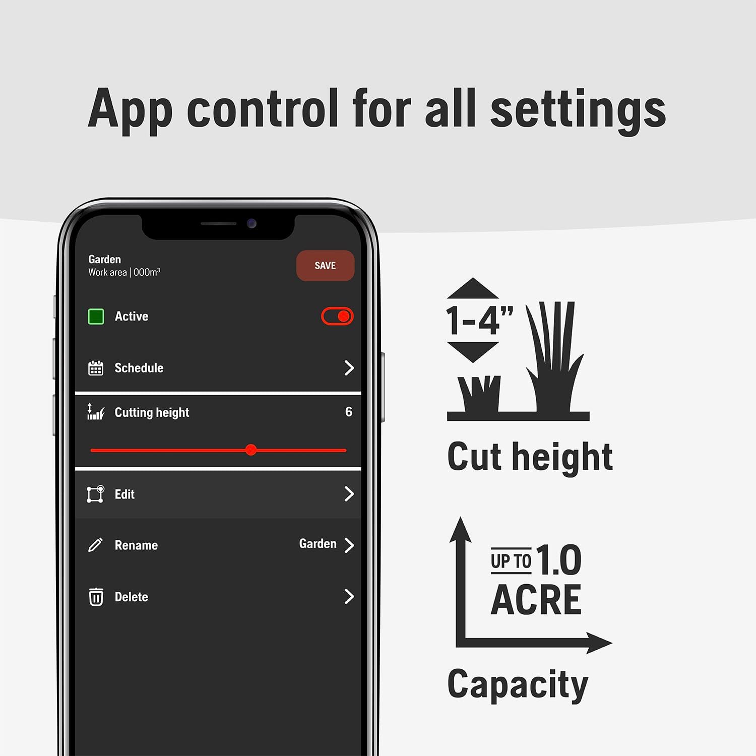 - Intelligently Engineered, Easy to Maintain: With a mowing capacity of 1 acres, the 420iQ can navigate slopes of up to 45%/24 degrees with a cut height range of 1-4”. The battery lawn mower's rugged bumper and larger wheels are designed to cross driveways, paths and more with ease. After mowing, maintenance is simple – swap blades in minutes and hose down for easy cleaning.
