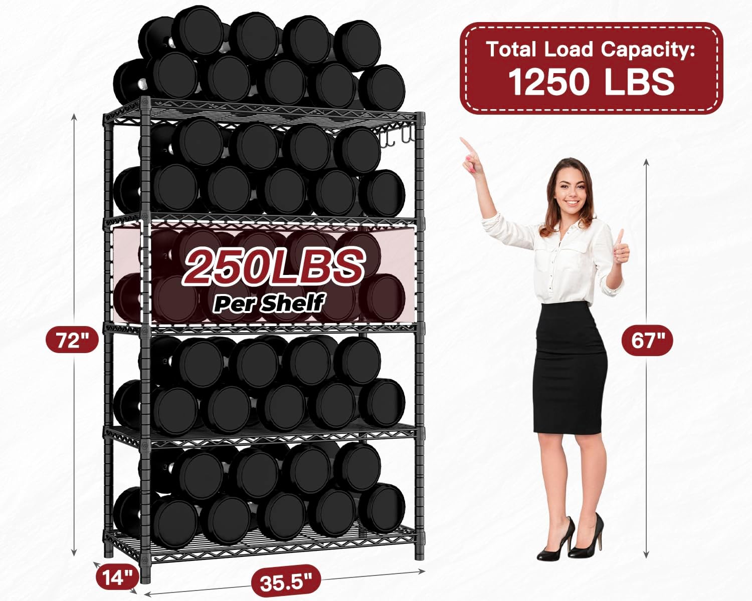 - 【5 Tier Metal Shelving for Storage with Side Hooks】This 5-tier heavy duty storage shelves measures 35.5" W x 14" D x 72" H, providing ample vertical storage space, greatly improving space utilization and making your space look organized. In addition, our wire storage shelving unit comes with 4 hooks for hanging towels, totes, clothes, etc, making reasonable use of more space and improving overall organization