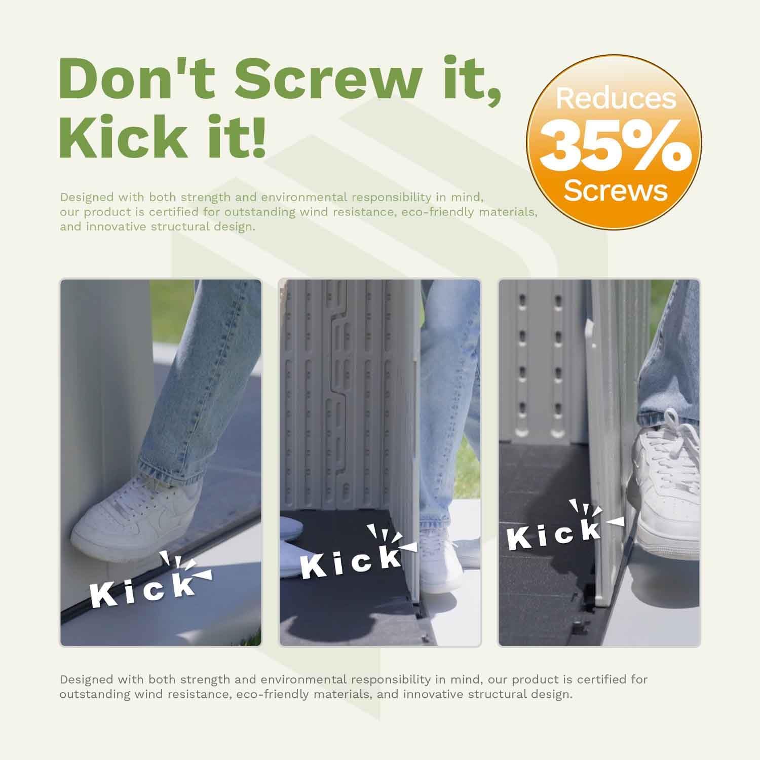- Interesting “Kick-it” Installation Process: This shed reduces the number of screws needed by 35%, making assembly quicker and easier. * When installing wall panels with a kicking action, press firmly downwards to ensure the bottom of the wall panel fully inserts into the ground slots. As shown in the video, once the bottom of the wall panel aligns perfectly with the ground, proceed with the kicking action.