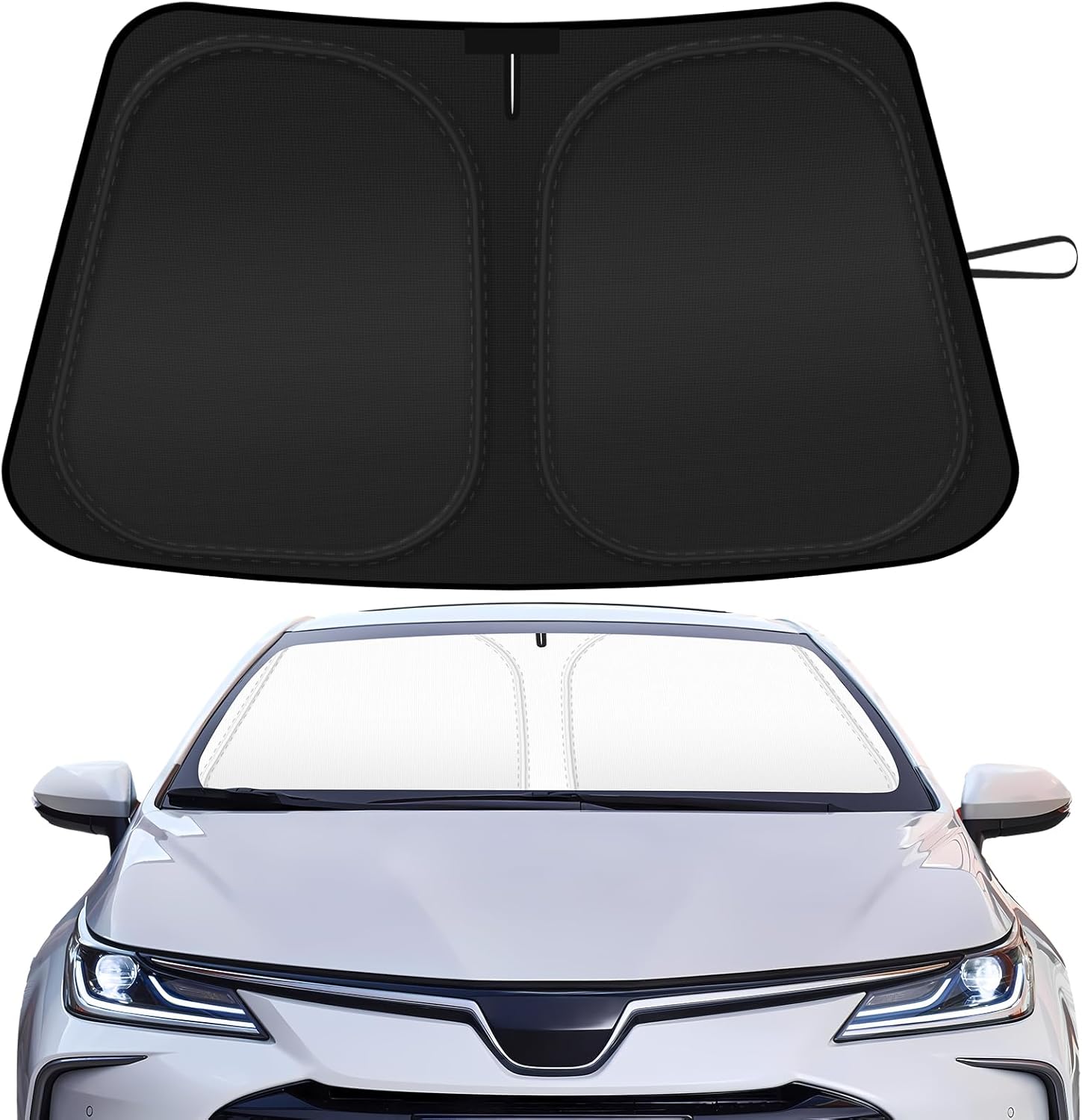 - 【Effective Interior Protection】The automotive windshield sunshades for corolla adopts a double-layer design, the silver layer in the car sun shade reflects sunlight falling on the windshield, and the black layer reduces the hot temperature inside the cabin. The car windshield cover sun shade prevents fading of upholstery and dashboards from UV rays, and reduces strain on the air conditioning system.