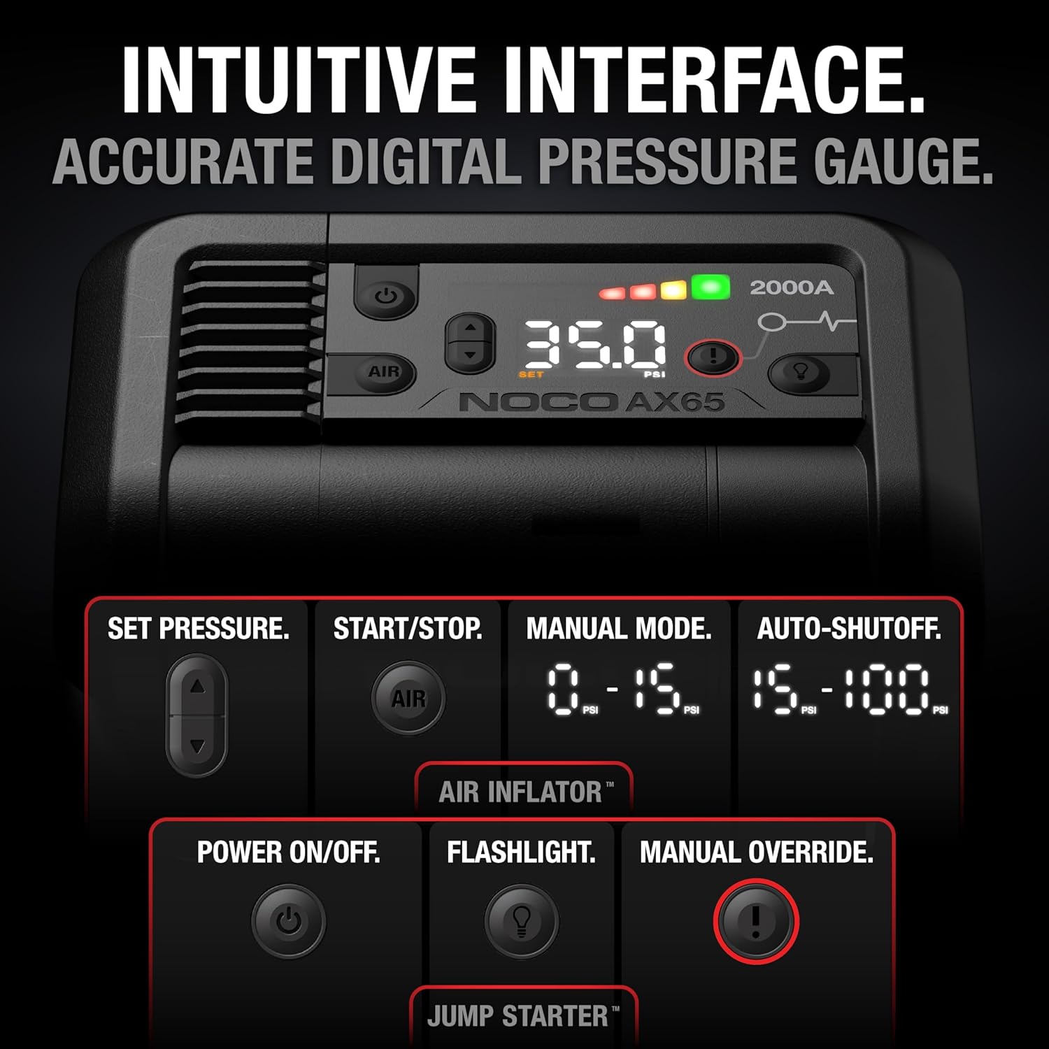 - ALL-NEW AX65 — A powerful all-in-one jump starter, ultra-fast tire inflator, power bank, and LED flashlight - built for total roadside independence. Delivers 2000 amps, rapid inflation, USB-C charging, and lighting when you need it most.