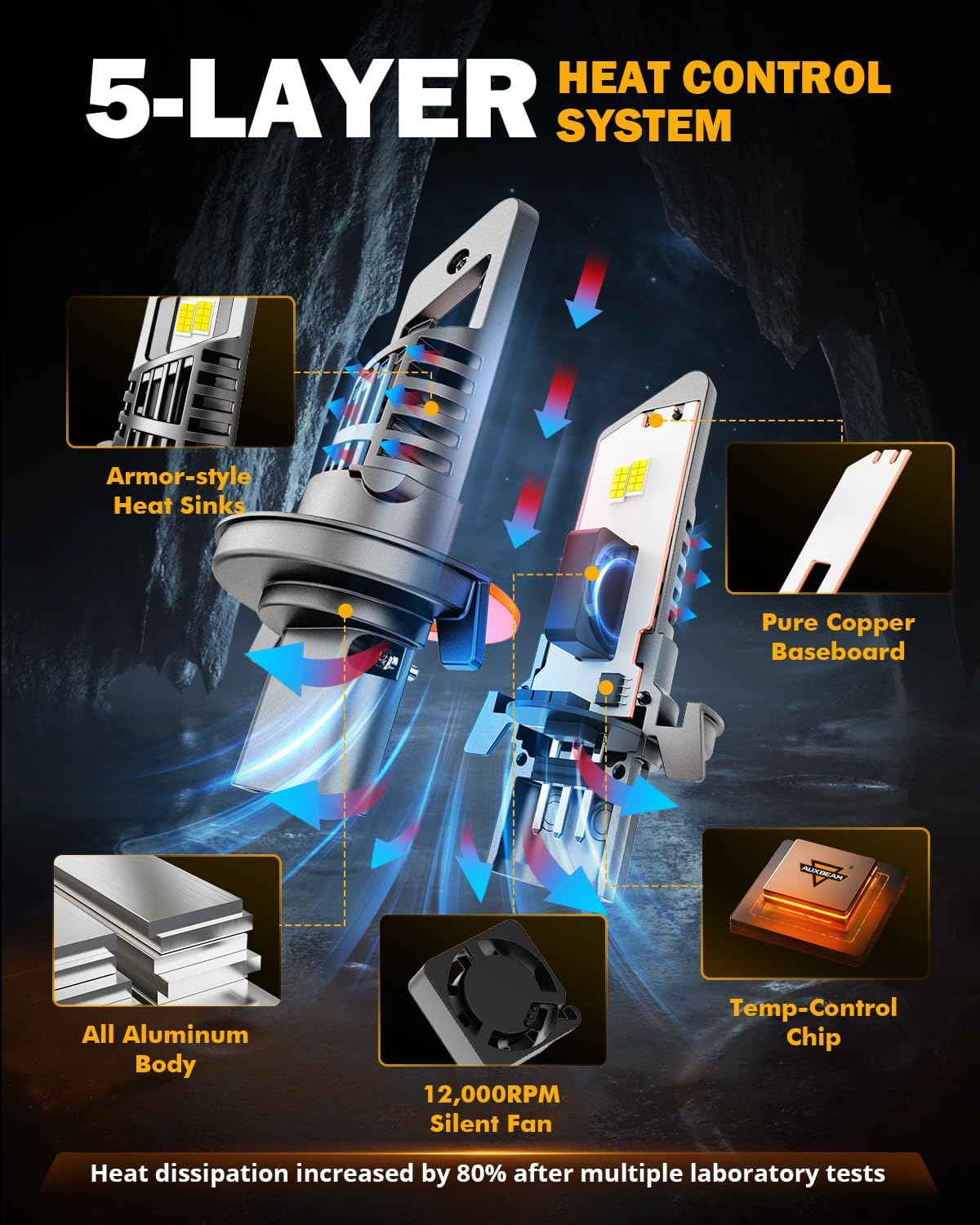 - TEMP CONTROL SYSTEM: Designed with built-in latest temp control chips, 12,000RPM 9-blade silent fan, pure copper baseboard, all 6063 aviation aluminum lamp body, armor-style heat sinks. Directly improves 80% heat dissipation and gain an extend service life over 50,000 hours.