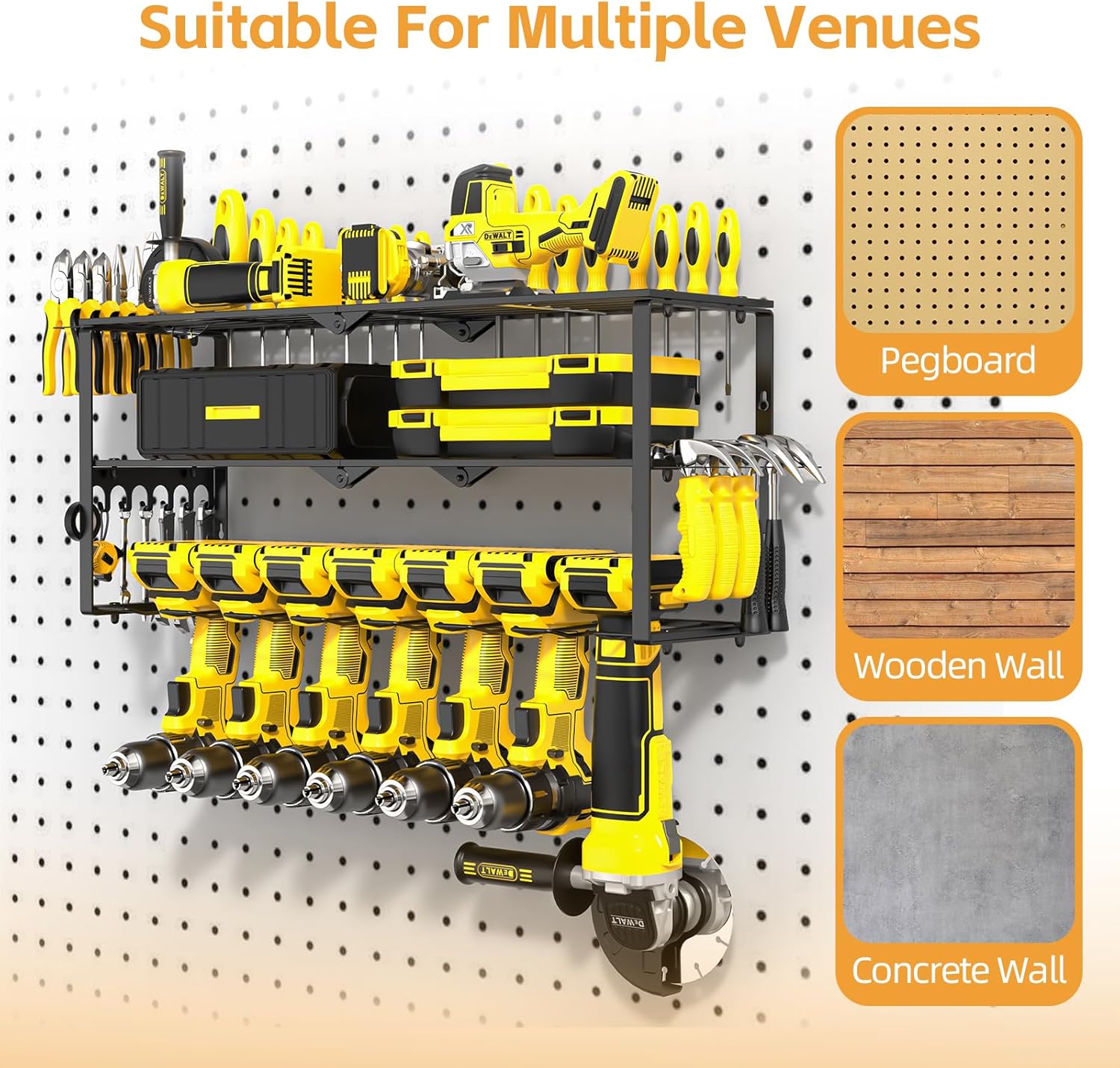 - Suitable for Different Wall Types: This drill holder wall mount includes mounting hardware like screws and nuts, so this power tool storage can be installed on the pegboard, concrete wall, brick wall and wooden wall easily.