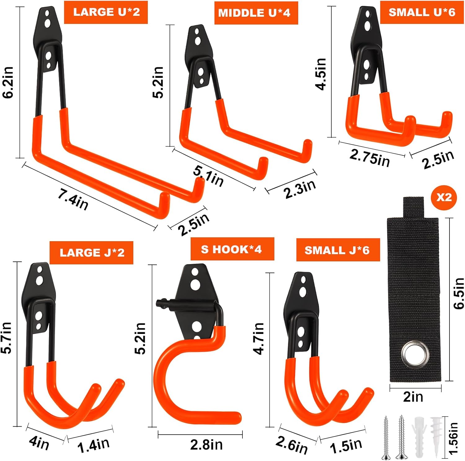 - ZexHok Wall Hook Assortment Set: 26 pack storage hooks organizer include with 6 sizes: 6pcs small J hooks, 6pcs small U hooks, 2pcs large J hooks, 4pcs middle U hooks, 2pcs large U hooks, 4pcs S hooks and 2pcs straps for hanging tools of different sizes and weight.