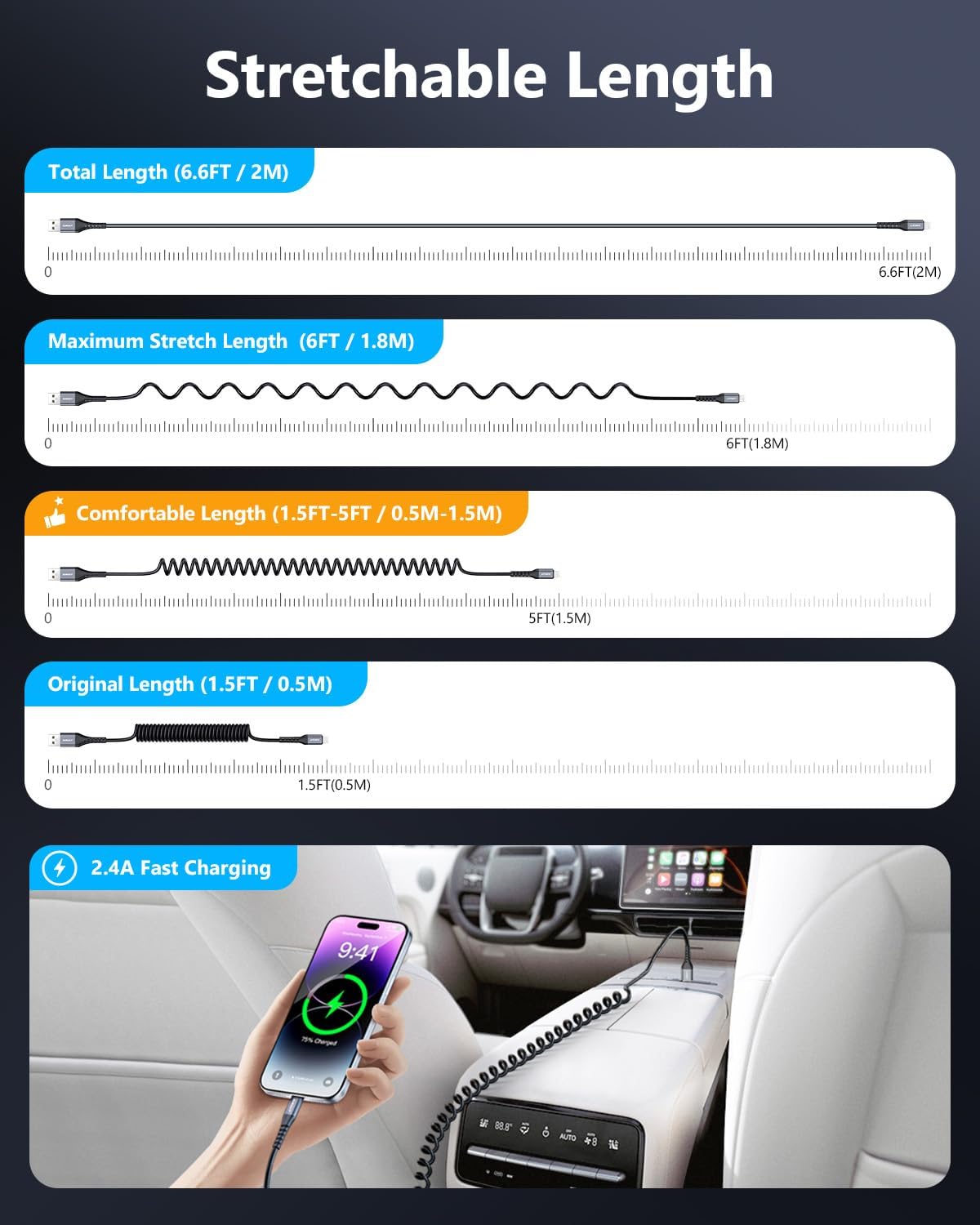 - 【Coiled Lightning Cable for Car】Retractable iPhone charger cable with spring-shaped design, anti-tangle. Compact and portable solution to keep your car console neat and organized; stretches up to 3-4 feet when needed and easily returns to its original 1.3-foot length.