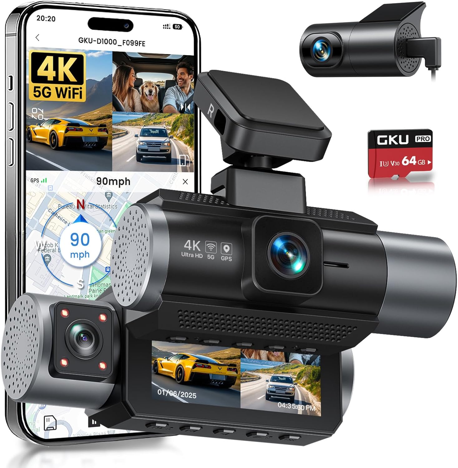 GKU 4K 3 Channel Dash Cam, 5.8GHz WiFi Built-in GPS, 4K+1080P+1080P Dash Cam Front and Rear Inside, 64GB Card Inserted, 24H Park Mode, Triple Car Camera 3 Inch Screen