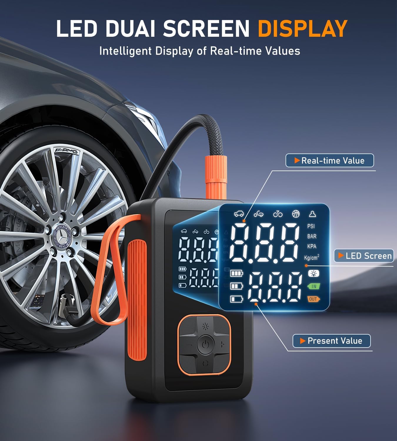 - 【Fast and Safe Inflation】Equipped with an intelligent sensing system, when the tire pressure reaches the preset value, it automatically stops inflating. The safety factor is maximized! The inflation rate soars to 36L/min, three times faster than normal tire inflator portable air compressors, allowing you to complete inflation in a short time