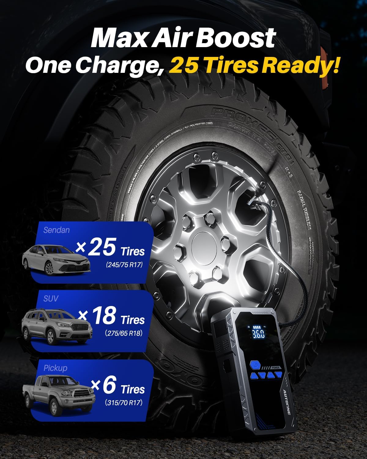 - 【High-Performance Air Compressor】Integrated with a high-performance air compressor, this jump box for car battery inflates tires for cars, motorcycles, bicycles, and more at 45 liters per minute. It quickly boosts tire pressure, such as inflating a pickup truck tire from 30PSI to 36PSI in just 2.5 minutes, ensuring optimal tire performance on the go. This versatile car jump starter with air compressor meets all your inflation needs.