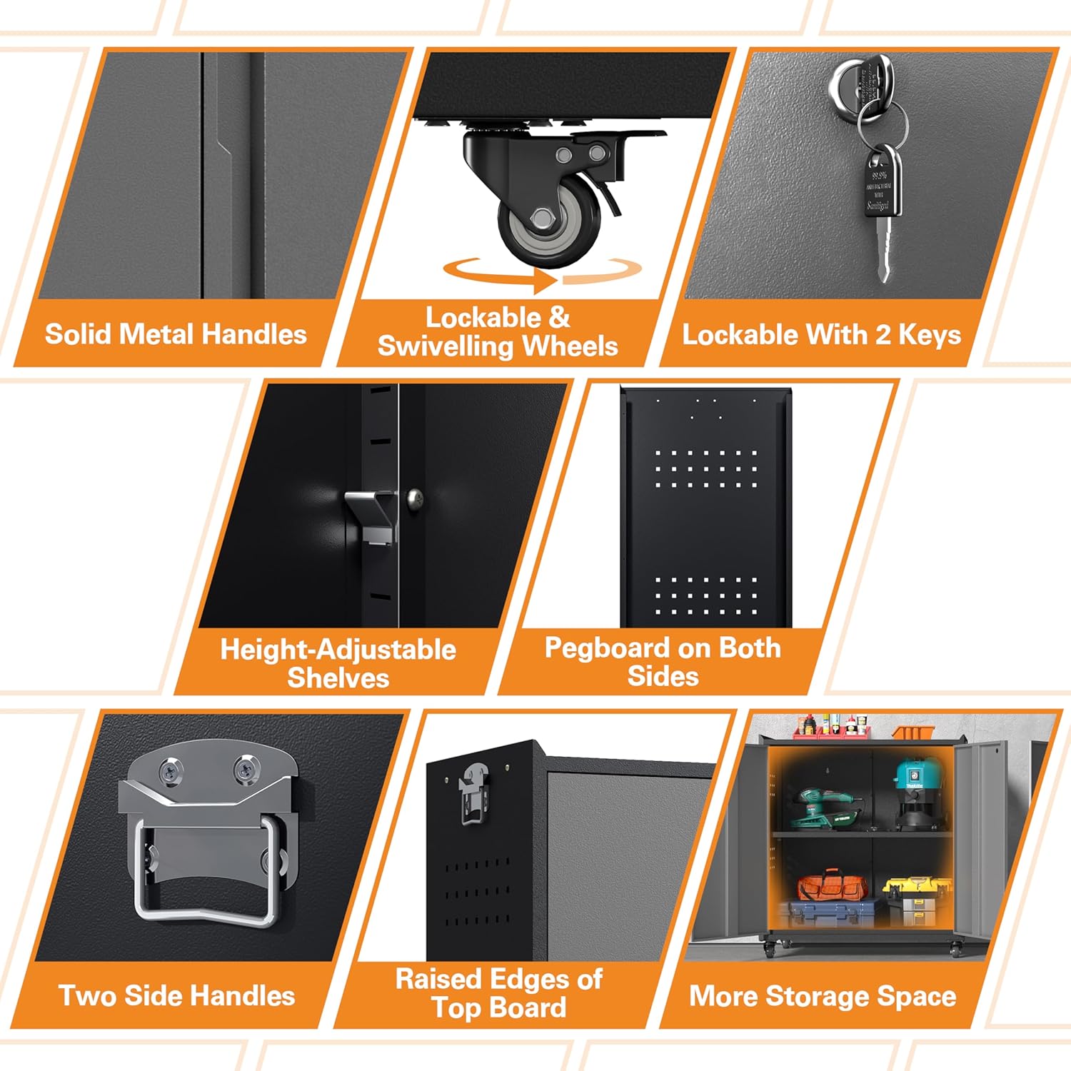 - 🧑🔧【Effortless Mobility and Easy Assembly】With four 360-degree swivel casters that can be locked when not in motion, this garage cabinets with wheels is easy to move around yet stable when needed. The included assembly instructions clearly illustrate each component and step, along with an assembly video for reference, enabling one person to complete the setup in approximately 40 minutes.