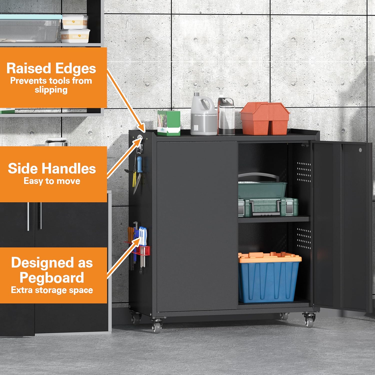 34" Metal Garage Storage Cabinet with Wheels, Adjustable Rolling Tool Storage Cabinet with Lock, Steel Locking Tool Cabinet with Doors and Shelves for Garage, Warehouse(Black)