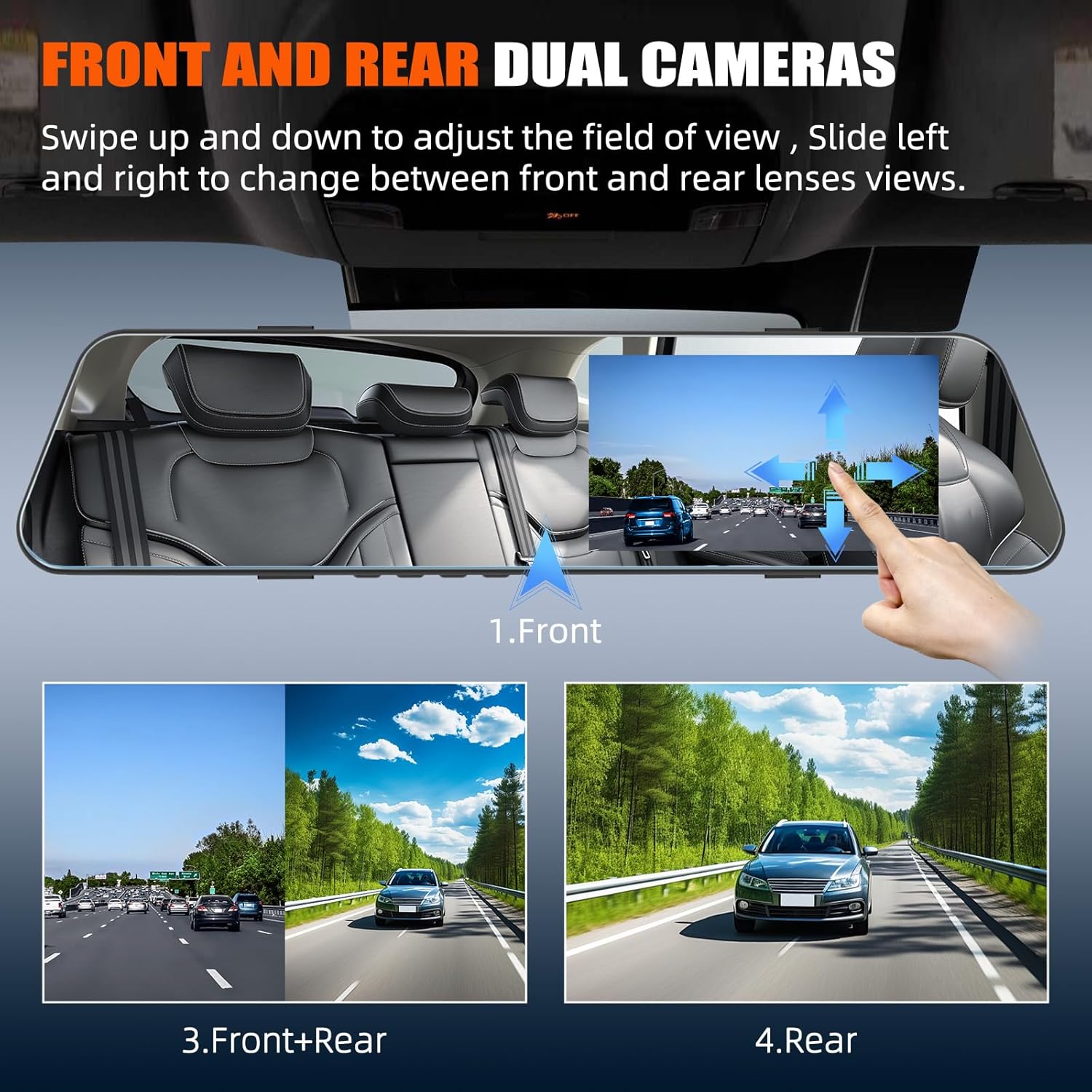 - 【720P Mirror Dash Cam】Upgrated 4.7 inch rear view mirror equipped with 720P front camera and 720P rear camera.Using large-diameter front and rear lenses and mature WDR technology. It has aurora capture technology, which can make the image bright and dark when encountering tunnels, night lights, etc.Adjustable front camera and 170° rear camera cover almost total field of view to reduce blind spot area and capture more scenes on the road