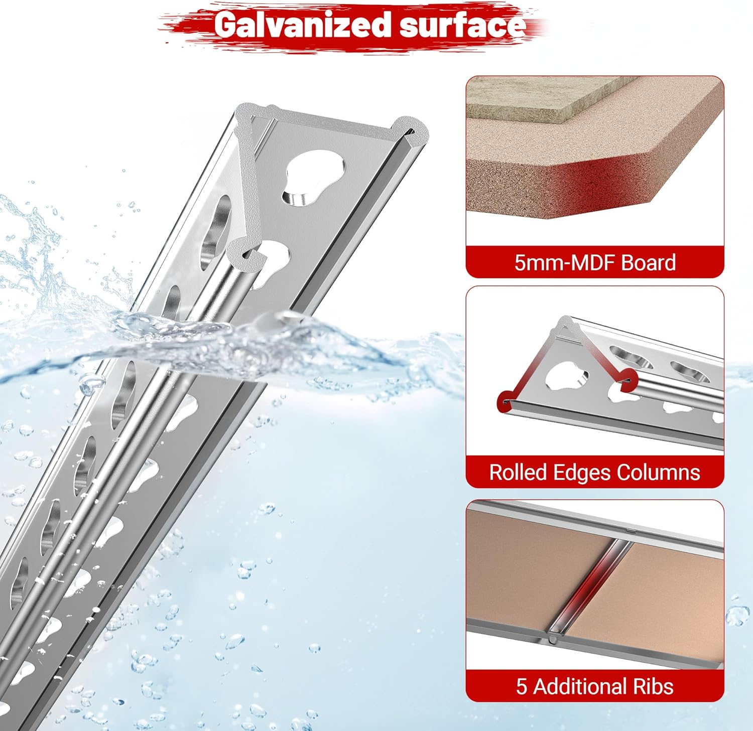 - 【Sturdy and Durable Garage Shelving】This garage shelves adopt rolled-edge thickened columns and 5 reinforced support ribs, constructed with optimized upgraded galvanized metal and durable MDF boards.This thoughtful design ensures the shelving unit remains stable and secure, even under heavy loads, without wobbling or collapsing