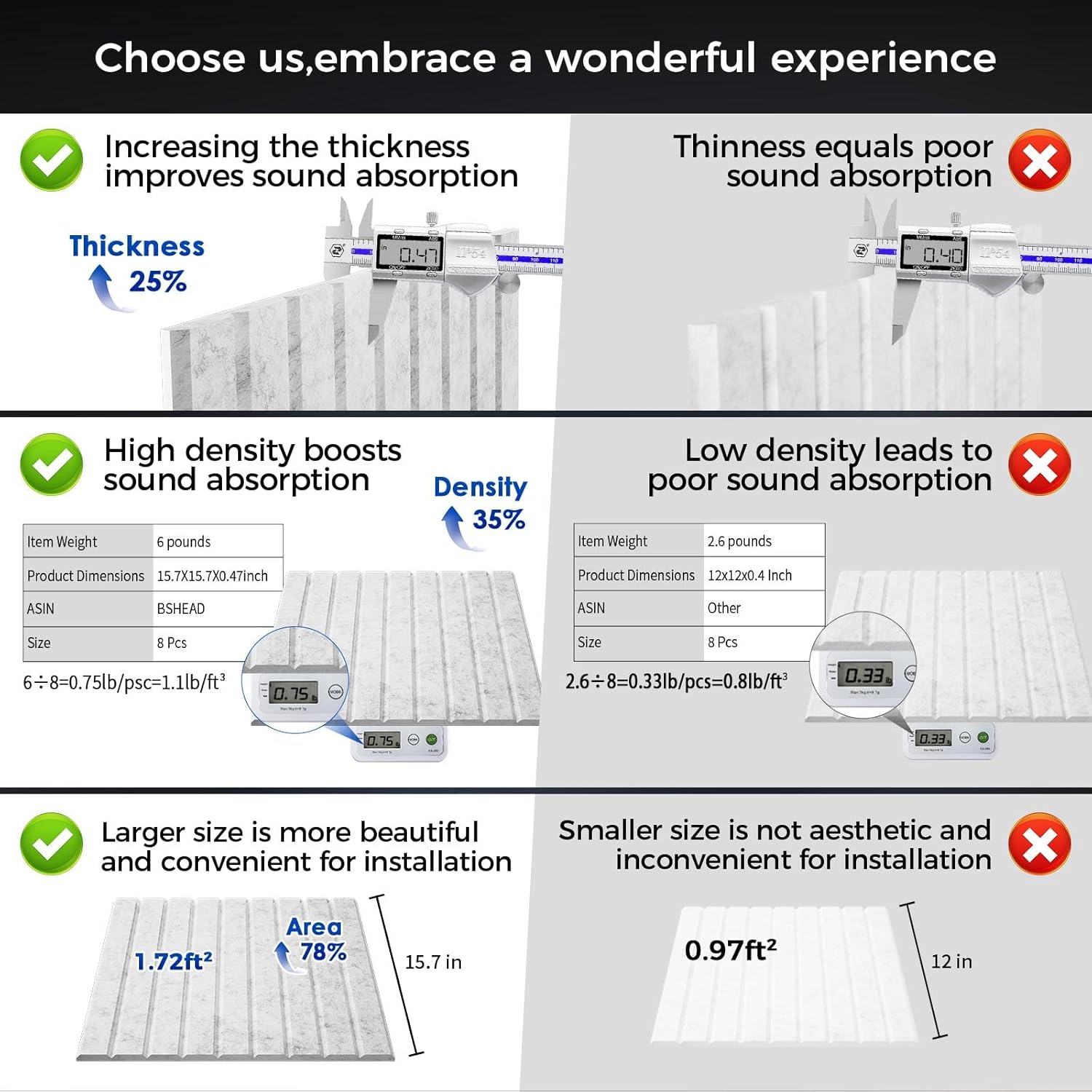 - 【Excellent Quality】: This sound panels is made of high-quality 100% polyester, odorless and flame retardant. There are no risks associated with spending long periods of time in a room with soundproof wall panels. And compared with traditional sound panels noise reducing for walls, our products have higher thickness (25% thicker) and density (35% denser)larger in size(178% area),which means better durability and sound absorption