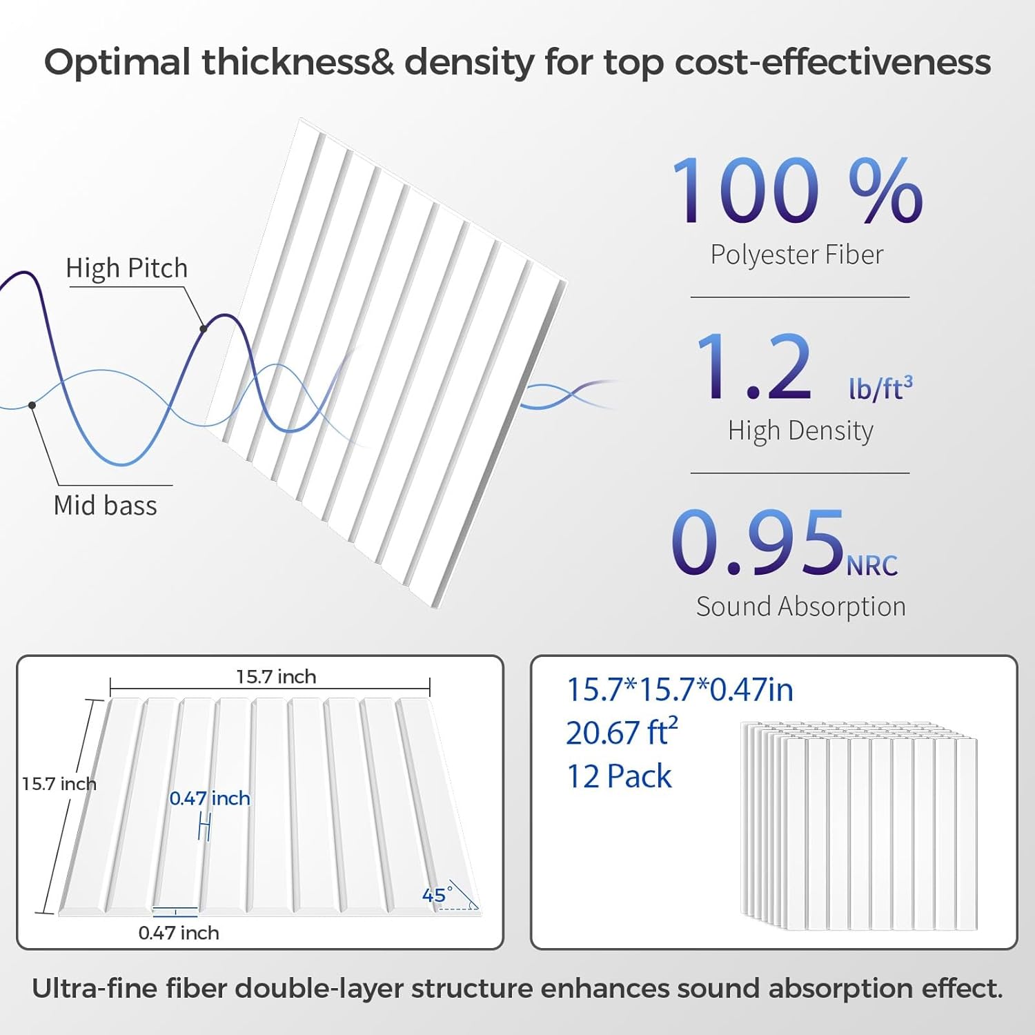 12 Pack Large Soundproof Wall Panels, 15.7 x 15.7 x 0.47 in Sound Proof Foam Panels for Walls, 1.2lb/ft³ High Density, Thicker 0.47in, Acoustic Panels, Sound Dampening Panels White
