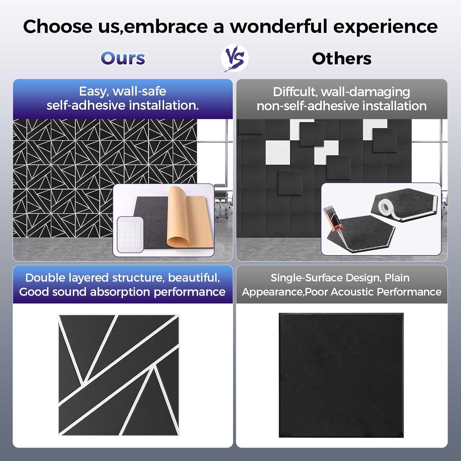 - Easy to Install/Remove: The acoustic panels sound absorbing adopt a self-adhesive design and can be installed on various surfaces without any tools, it can be installed on a variety of different surfaces such as walls, doors and ceilings. Just tear off the first layer of double-sided tape, no additional glue is needed, and it will not leave traces when removed. Save time and money. Spare double-sided tape is provided to ensure you have flexibility during installation.