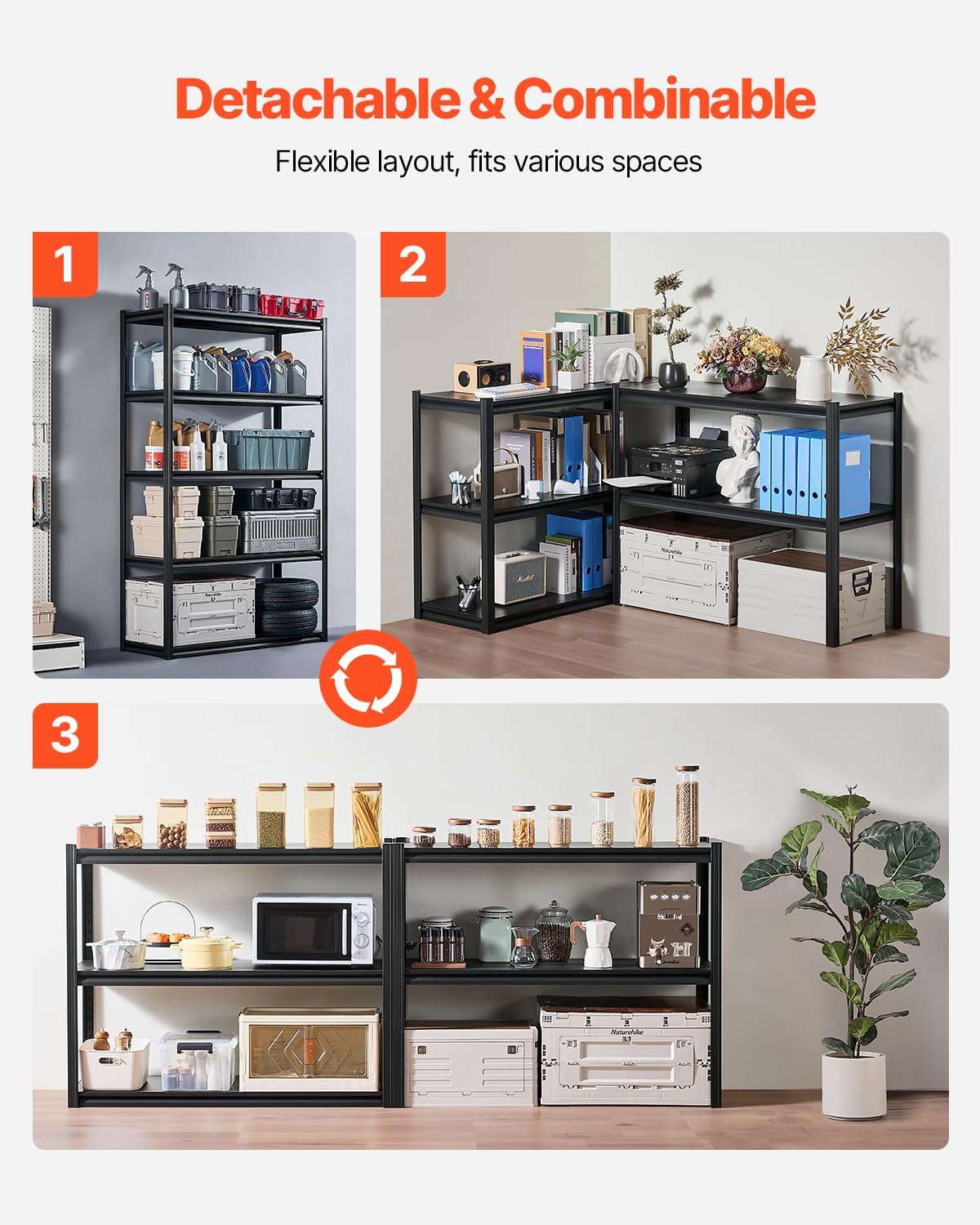 - Split Design: This garage shelving unit can be split into two separate racks for flexible use in spaces with height restrictions, such as under stairs, basements, or hallway corners.