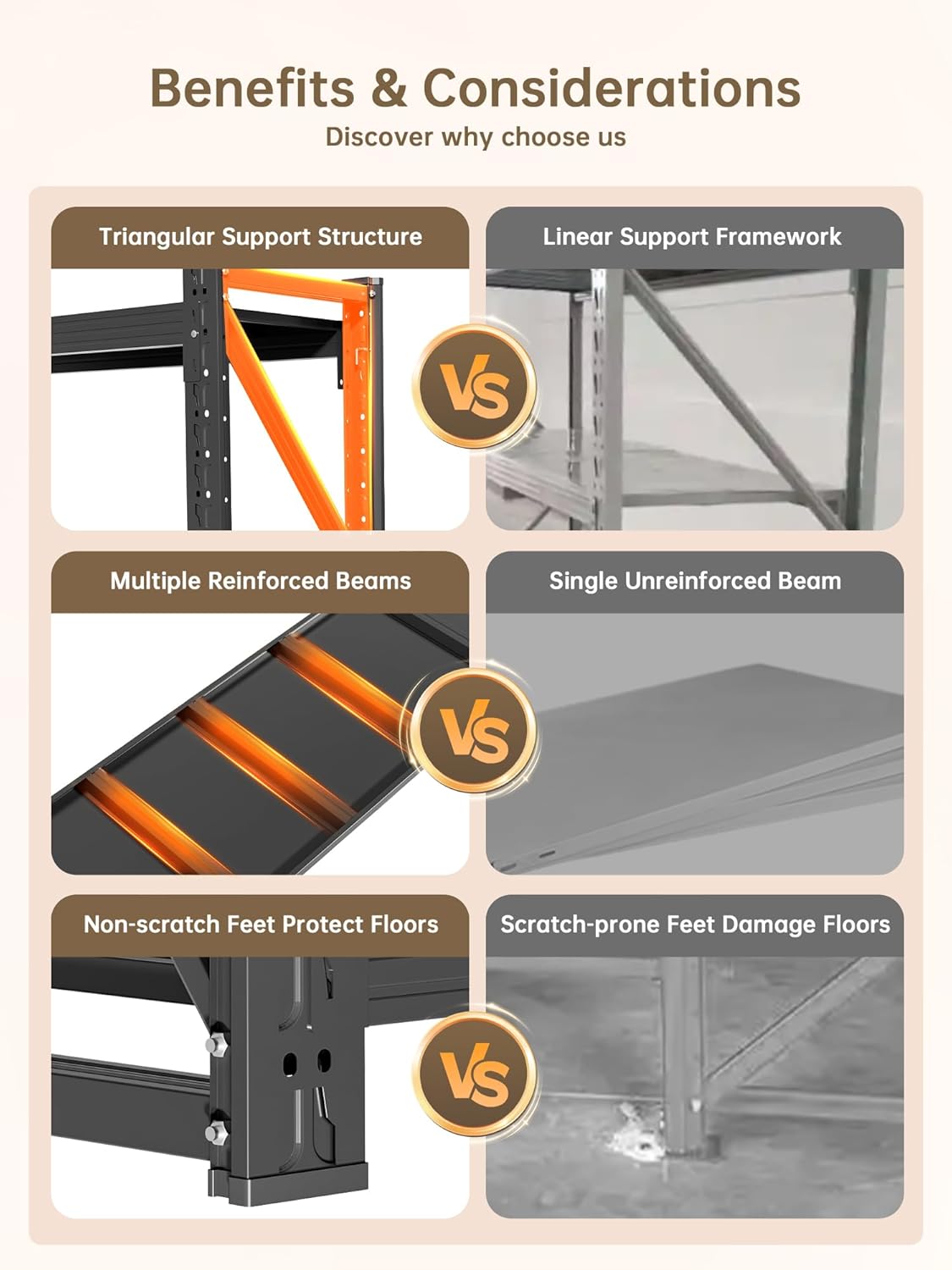 - [Stable Design for Safety & Durability]Reinforced crossbars and anti-slip rubber feet ensure stability on uneven floors.these metal storage shelves durability outperforms wooden shelves,ensure the safety and security of your stored items