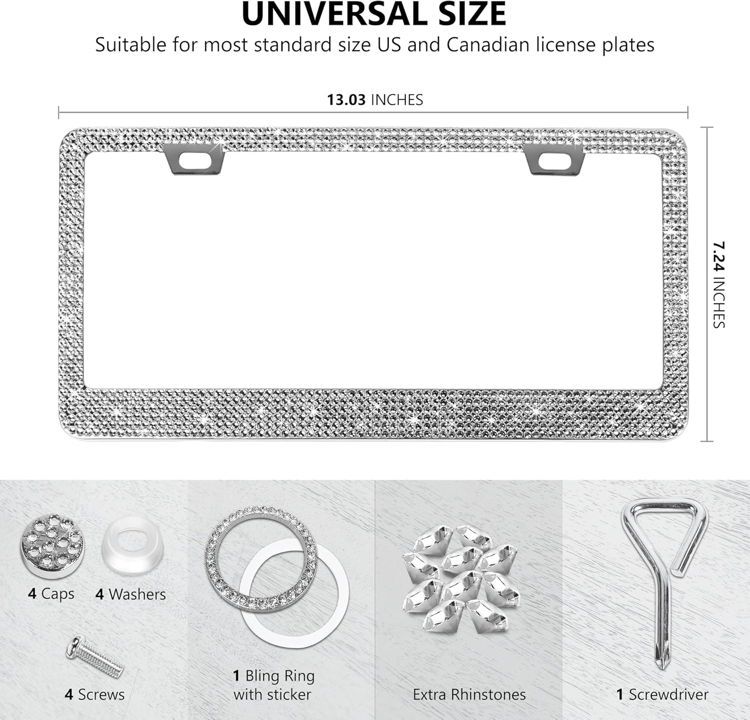 - VALUE FOR MONEY PACK: Motorfi's silver bling license plate frames for women include 2 diamond license plate frames, 4 screw caps, 4 screws, 4 washers, a screwdriver, 1 knob ring, and extra crystals for easy, tool-free installation and theft protection.