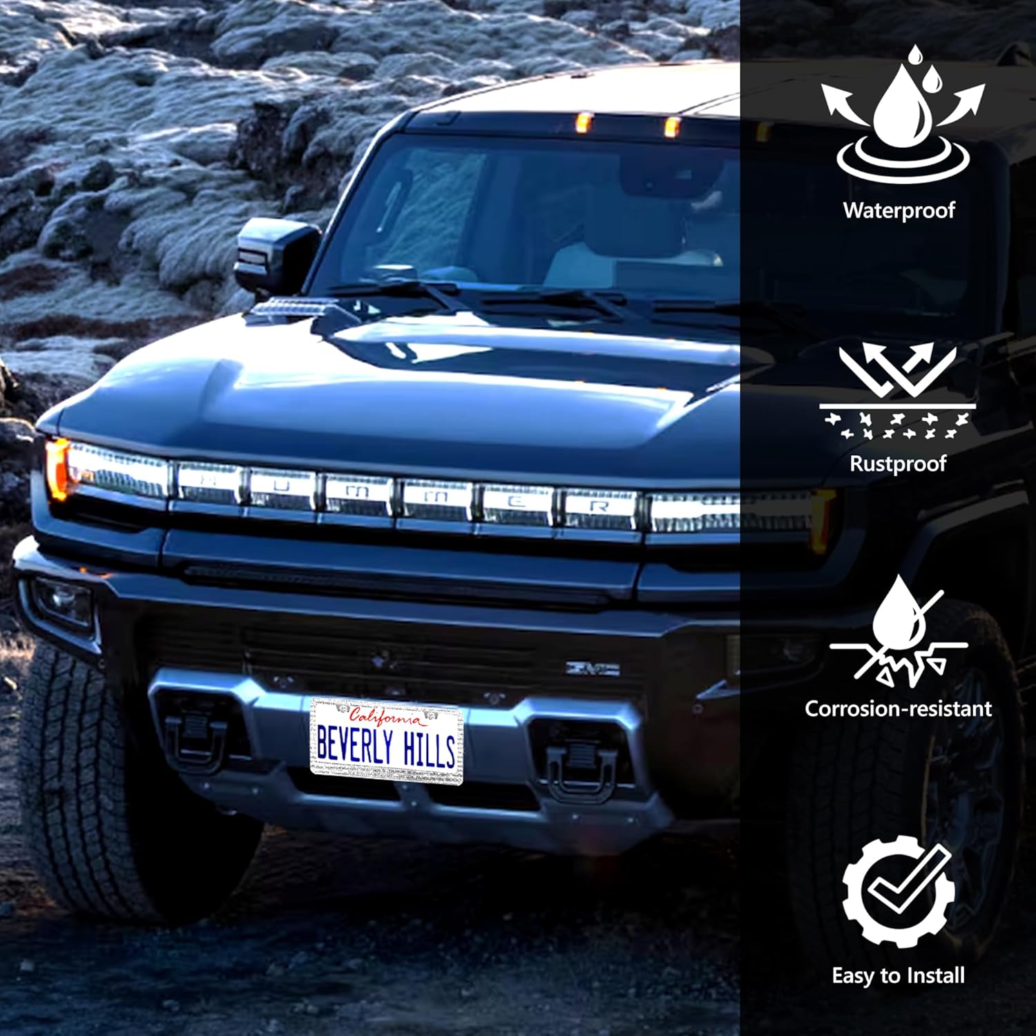 - PREMIUM QUALITY: These sparkly license plate frames for women are made from durable stainless steel and glass rhinestones, this waterproof frame withstands harsh weather and high temperatures. Smooth, polished edges prevent scratches, while rhinestones add an elegant touch.