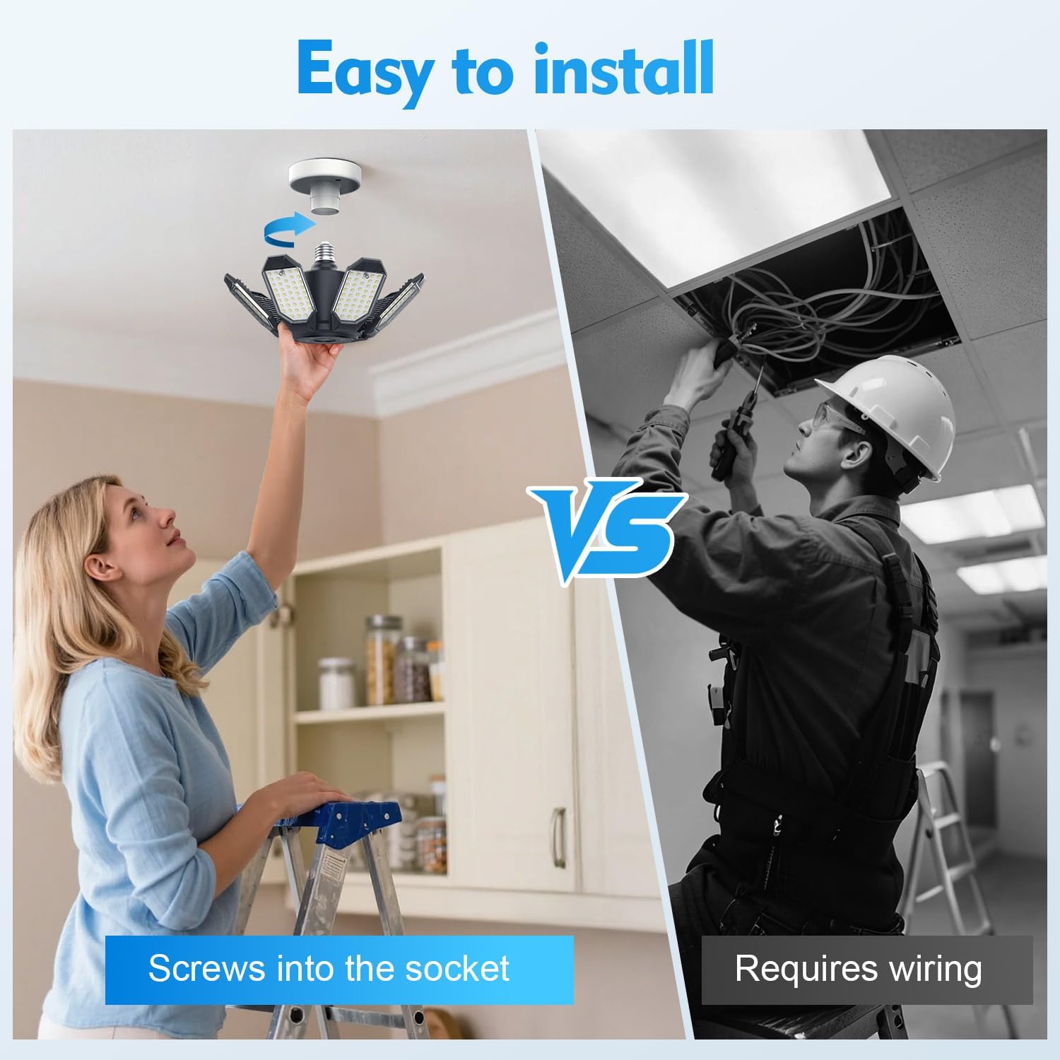 - 【2025 LED Garage Lights 】2025 upgraded with new garage lights, with 200high-quality LED chips, garage lights output is 20000 lumens at 65000 K "daylight" for your garage, offering no dark areas, flickering or glare, bringing you a more comfortable Visual lighting experience. Tip: This is not a motion-sensing garage light.